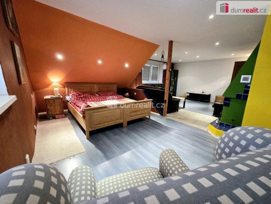 Ve druhém podlaží najdeme ložnici (s vlastním krbem), která se propojila s obývací částí. Tyto prostory lze přepažit a vzniknou tak dvě samostatné místnosti. V patře je také další samostatná pracovna, ze které může vzniknout například dětský pokoj. V horní koupelně najdeme mimo sprchového koutu a toalety, také vanu. Obě koupelny v domě mají podlahové vytápění. V patře je vybudováno několik skříní na míry, kde třeba v koupelně se podařilo vtipně schovat pračku s šatnou.