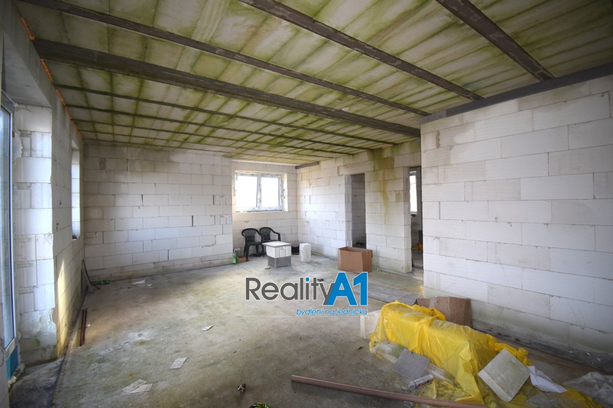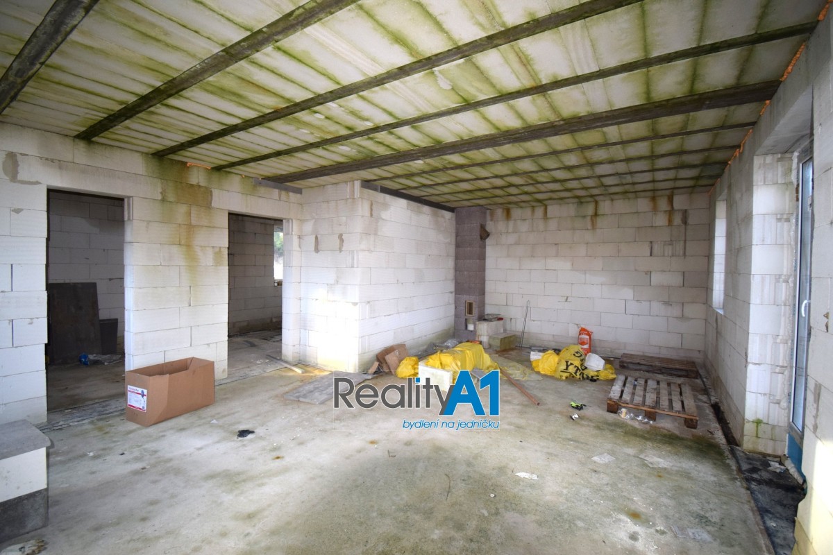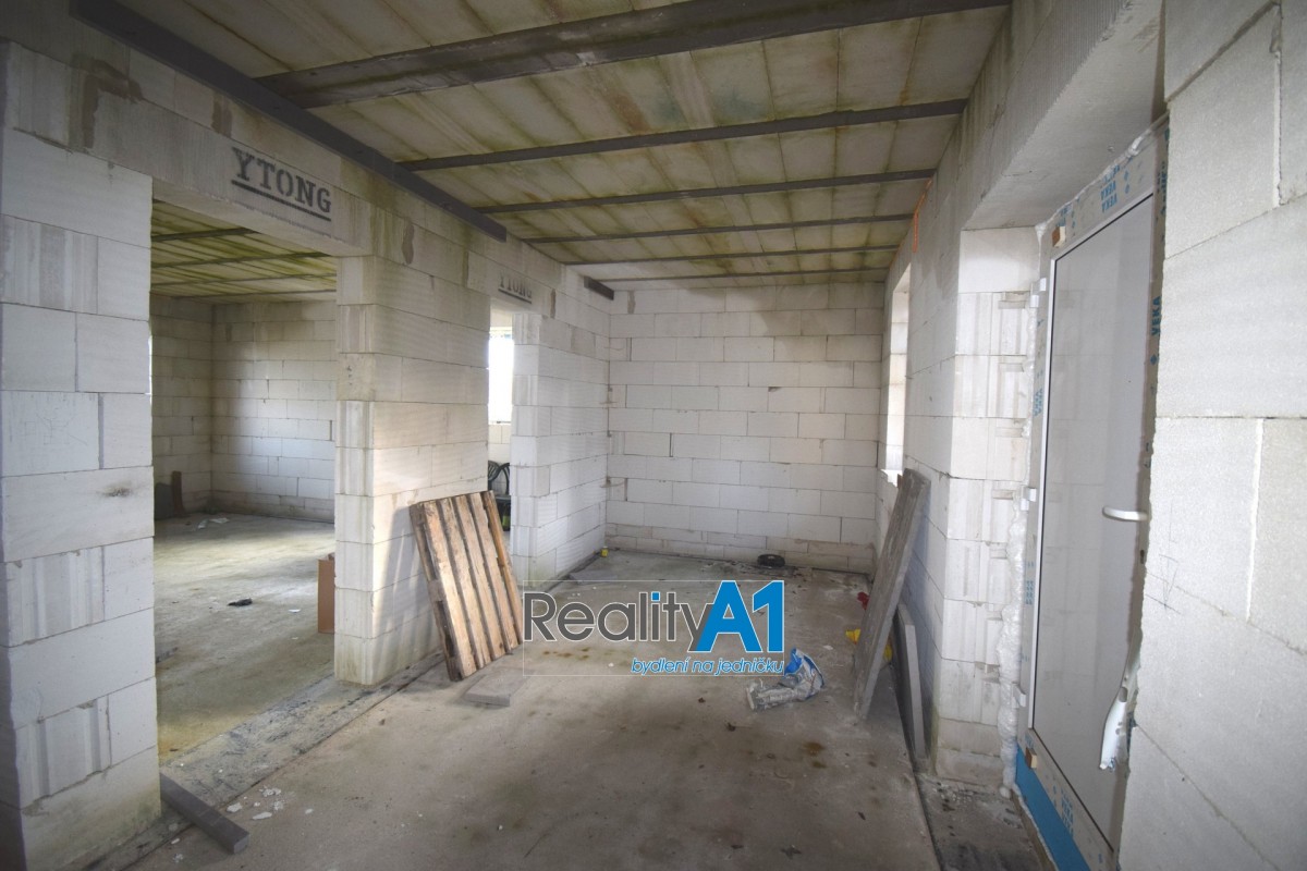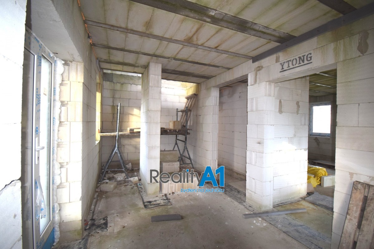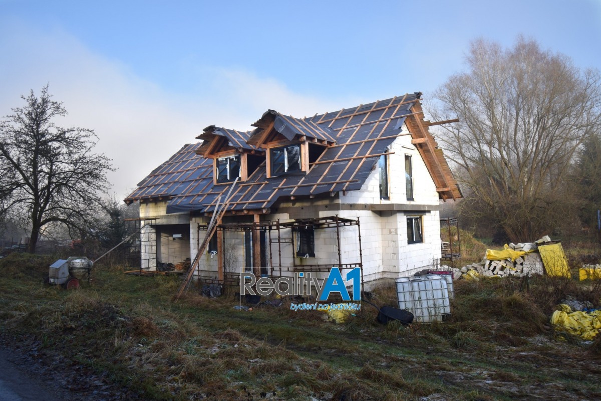 Dům je navržen dispozičně tak, aby vyhovoval 4 - 5 členné rodině - projekt Hit3 od Gservis. V přízemí je navržena vstupní chodba, obývací pokoj s kuchyňským koutem, koupelna s sociální zařízení WC, technická místnost, přes kterou je průchod do prostorné garáže. V prvním patře jsou navrženy v pravé části 3 dětské pokoje a koupelna s sociální zařízení WC. Levá část prvního patra je určena pro rodiče, kde je ložnice se šatnou a vlastní koupelnou s sociální zařízení WC. V současné době nejsou ještě příčky vyzděny a je možné vnitřní dispozici upravit – cihly na příčky jsou součástí prodeje. Stavba domu je z porobetonu Ytong s dřevěným trámovím a prkenným záklopem s pojistnou fólií pro lehkou třešní krytinu. Okna a vstupními dveřmi jsou již osazena. Vstupy do domu jsou jak z přední části hlavním vchodem, garážovými vraty a propojením do domu, zadním vchodem do garáže ze zahrady a výstupem z obývacího pokoje na terasu. Dům bude napájen vodou z vlastního vrtu, který je již vyvrtán. Odpad bude řešen ČOV (osobní vlastnictví). Dům je napojen na elektrický proud. Vytápění celého domu je navrženo podlahovým topením s tepelným čerpadlem a lokálně krbovými kamny v obývacím pokoji.
