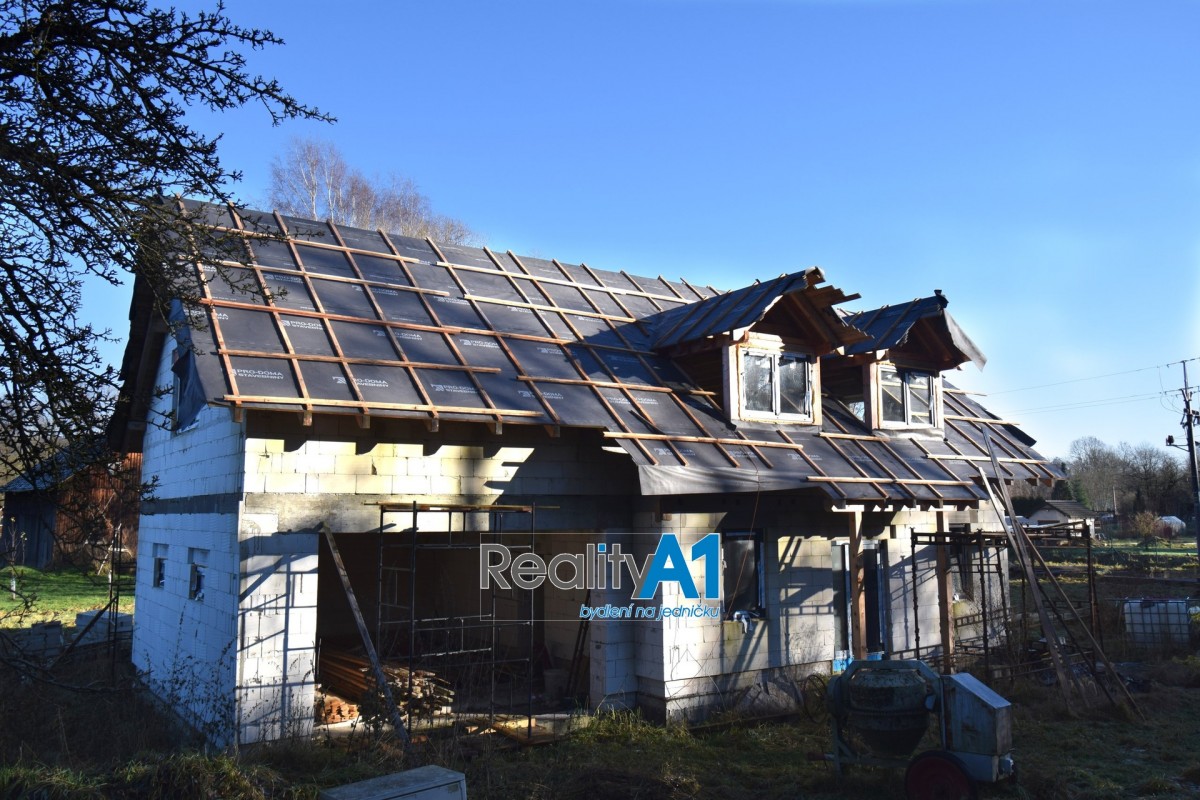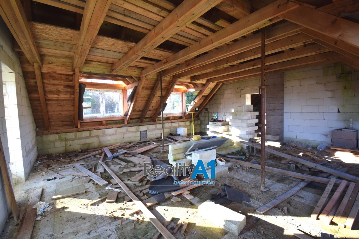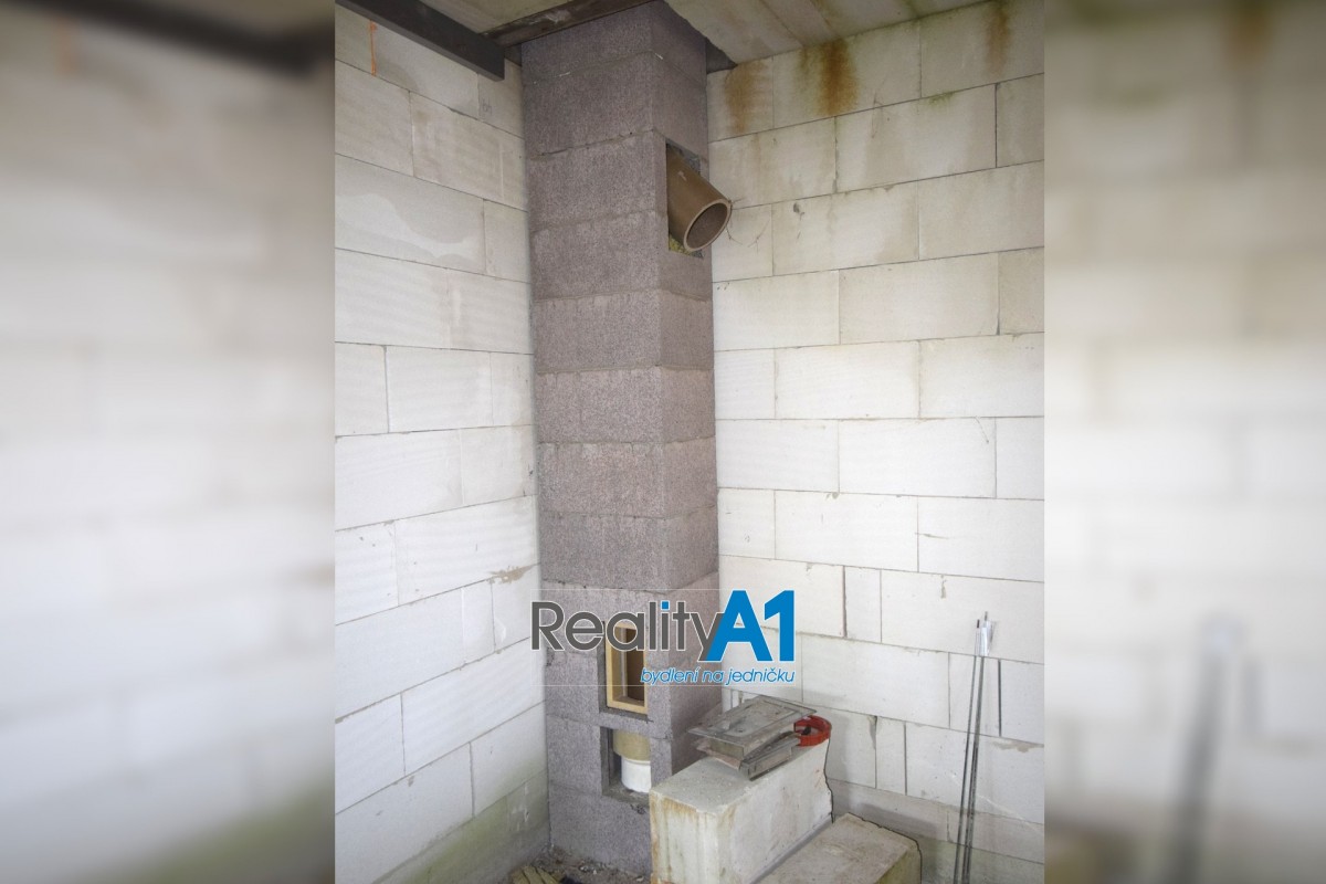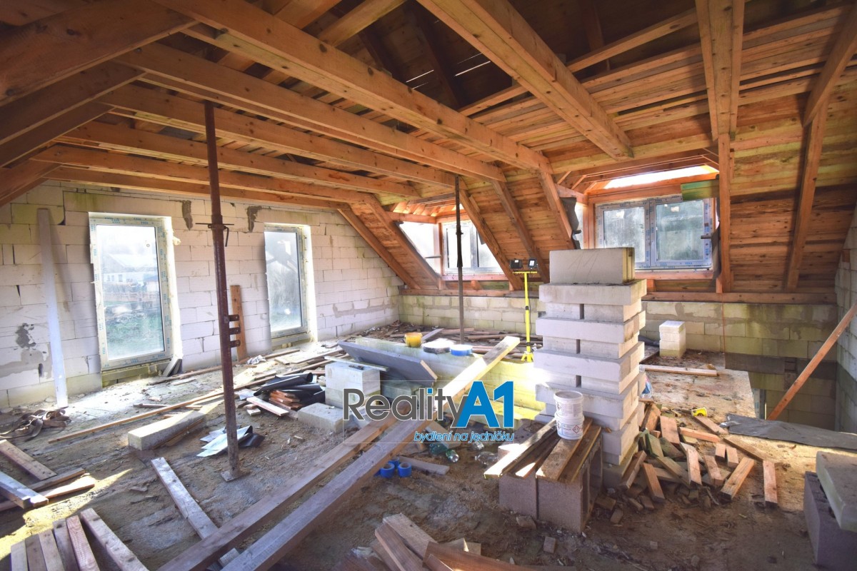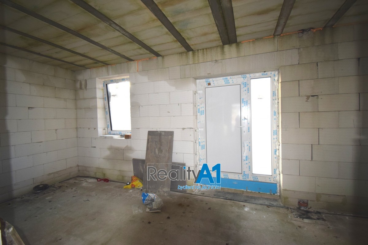 Dům je navržen dispozičně tak, aby vyhovoval 4 - 5 členné rodině - projekt Hit3 od Gservis. V přízemí je navržena vstupní chodba, obývací pokoj s kuchyňským koutem, koupelna s sociální zařízení WC, technická místnost, přes kterou je průchod do prostorné garáže. V prvním patře jsou navrženy v pravé části 3 dětské pokoje a koupelna s sociální zařízení WC. Levá část prvního patra je určena pro rodiče, kde je ložnice se šatnou a vlastní koupelnou s sociální zařízení WC. V současné době nejsou ještě příčky vyzděny a je možné vnitřní dispozici upravit – cihly na příčky jsou součástí prodeje. Stavba domu je z porobetonu Ytong s dřevěným trámovím a prkenným záklopem s pojistnou fólií pro lehkou třešní krytinu. Okna a vstupními dveřmi jsou již osazena. Vstupy do domu jsou jak z přední části hlavním vchodem, garážovými vraty a propojením do domu, zadním vchodem do garáže ze zahrady a výstupem z obývacího pokoje na terasu. Dům bude napájen vodou z vlastního vrtu, který je již vyvrtán. Odpad bude řešen ČOV (osobní vlastnictví). Dům je napojen na elektrický proud. Vytápění celého domu je navrženo podlahovým topením s tepelným čerpadlem a lokálně krbovými kamny v obývacím pokoji.