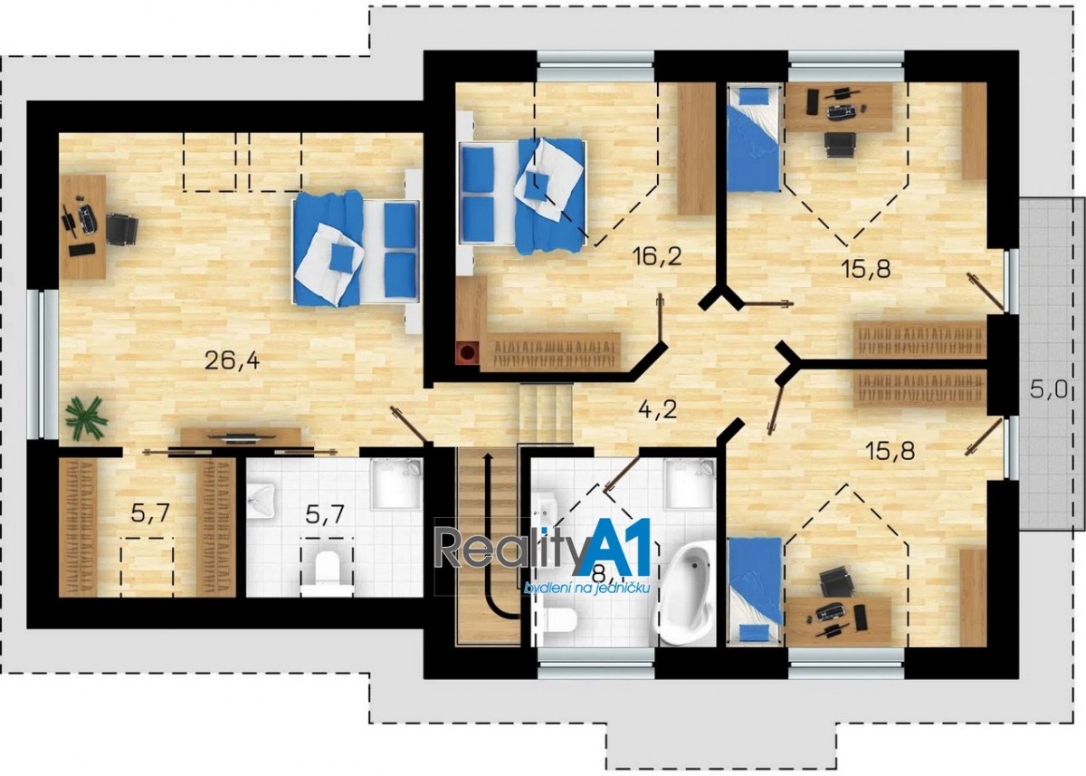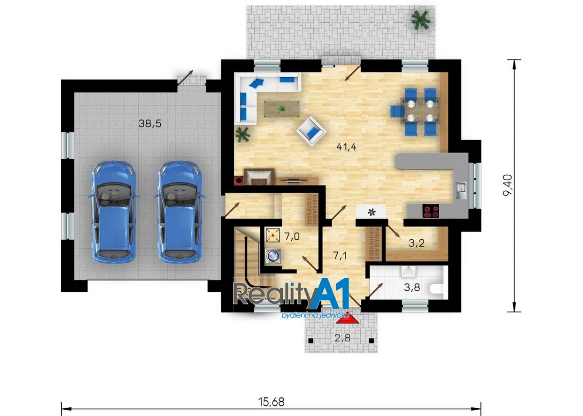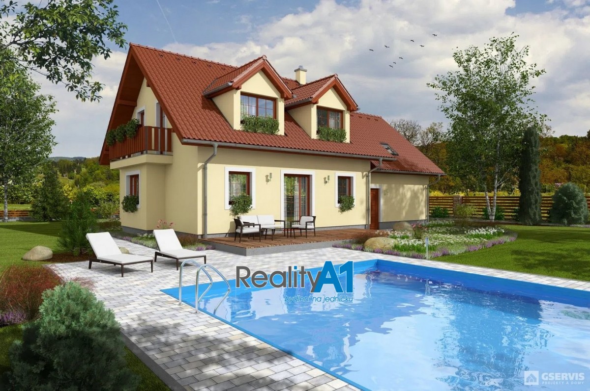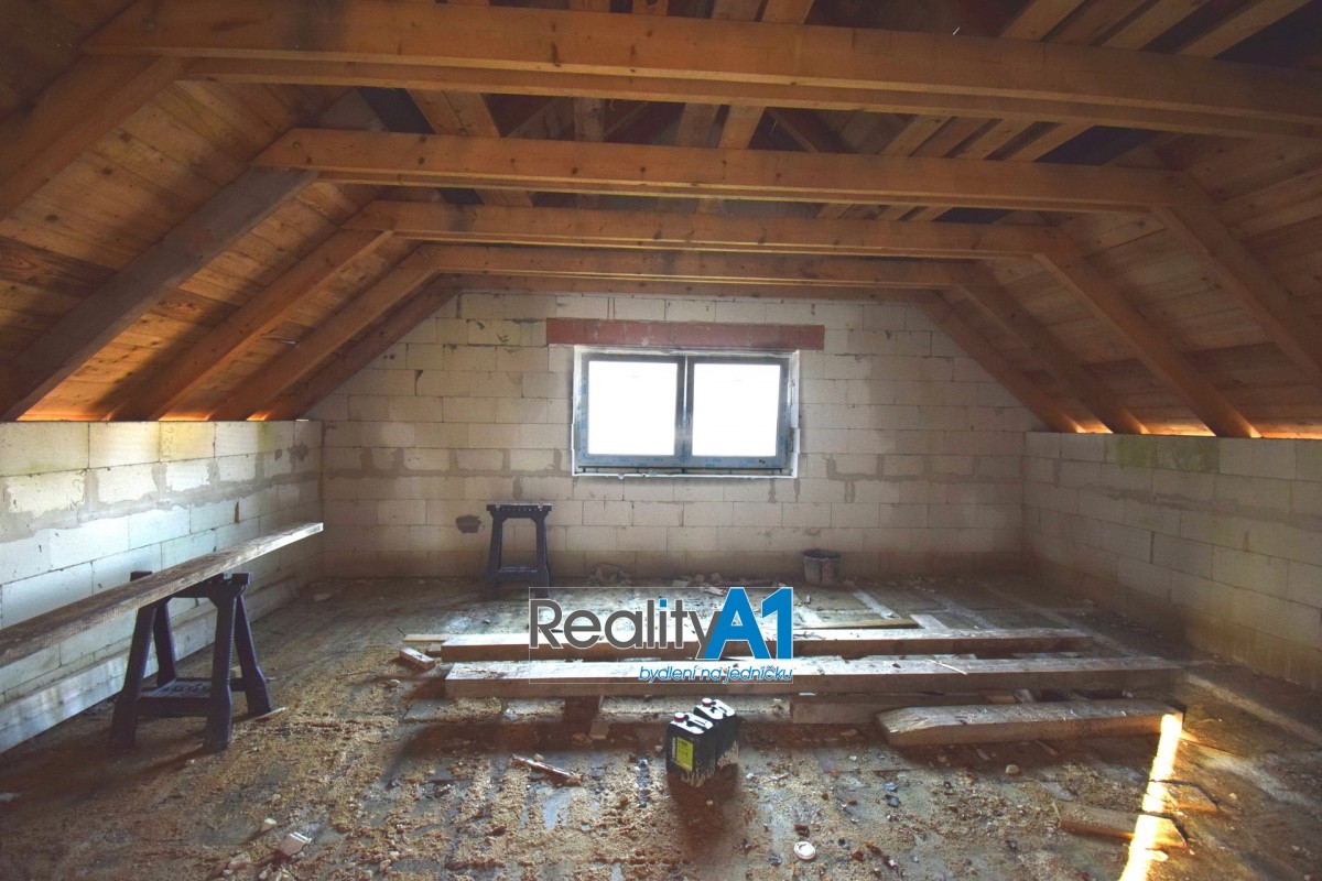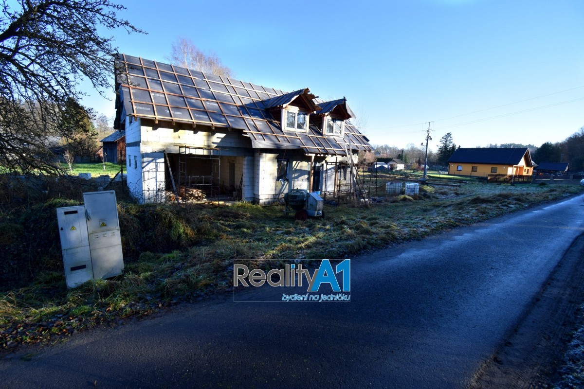 Dům je navržen dispozičně tak, aby vyhovoval 4 - 5 členné rodině - projekt Hit3 od Gservis. V přízemí je navržena vstupní chodba, obývací pokoj s kuchyňským koutem, koupelna s sociální zařízení WC, technická místnost, přes kterou je průchod do prostorné garáže. V prvním patře jsou navrženy v pravé části 3 dětské pokoje a koupelna s sociální zařízení WC. Levá část prvního patra je určena pro rodiče, kde je ložnice se šatnou a vlastní koupelnou s sociální zařízení WC. V současné době nejsou ještě příčky vyzděny a je možné vnitřní dispozici upravit – cihly na příčky jsou součástí prodeje. Stavba domu je z porobetonu Ytong s dřevěným trámovím a prkenným záklopem s pojistnou fólií pro lehkou třešní krytinu. Okna a vstupními dveřmi jsou již osazena. Vstupy do domu jsou jak z přední části hlavním vchodem, garážovými vraty a propojením do domu, zadním vchodem do garáže ze zahrady a výstupem z obývacího pokoje na terasu. Dům bude napájen vodou z vlastního vrtu, který je již vyvrtán. Odpad bude řešen ČOV (osobní vlastnictví). Dům je napojen na elektrický proud. Vytápění celého domu je navrženo podlahovým topením s tepelným čerpadlem a lokálně krbovými kamny v obývacím pokoji.