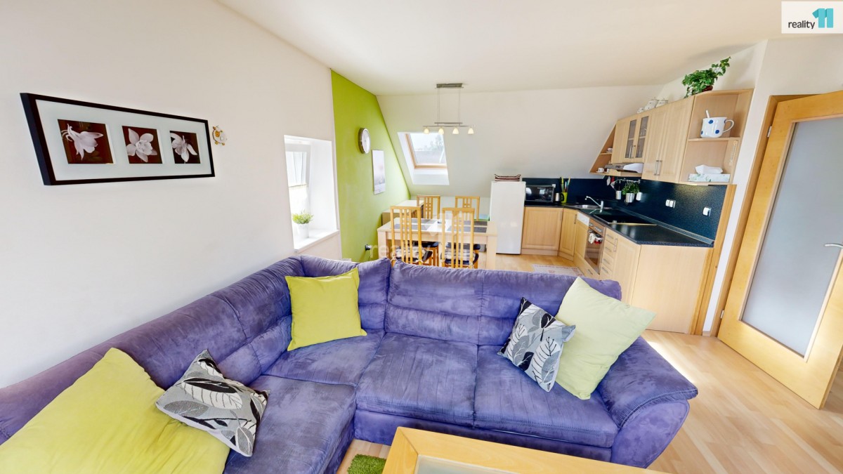 Dispoziční členění bytu 3+kk(podkroví): zádveří, schodiště, chodba, kuchyně s jídelním koutem a obývacím pokojem, pokoj 1, samostatné sociální zařízení WC, koupelna, ložnice.