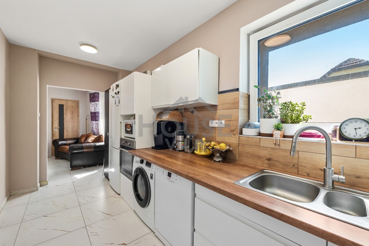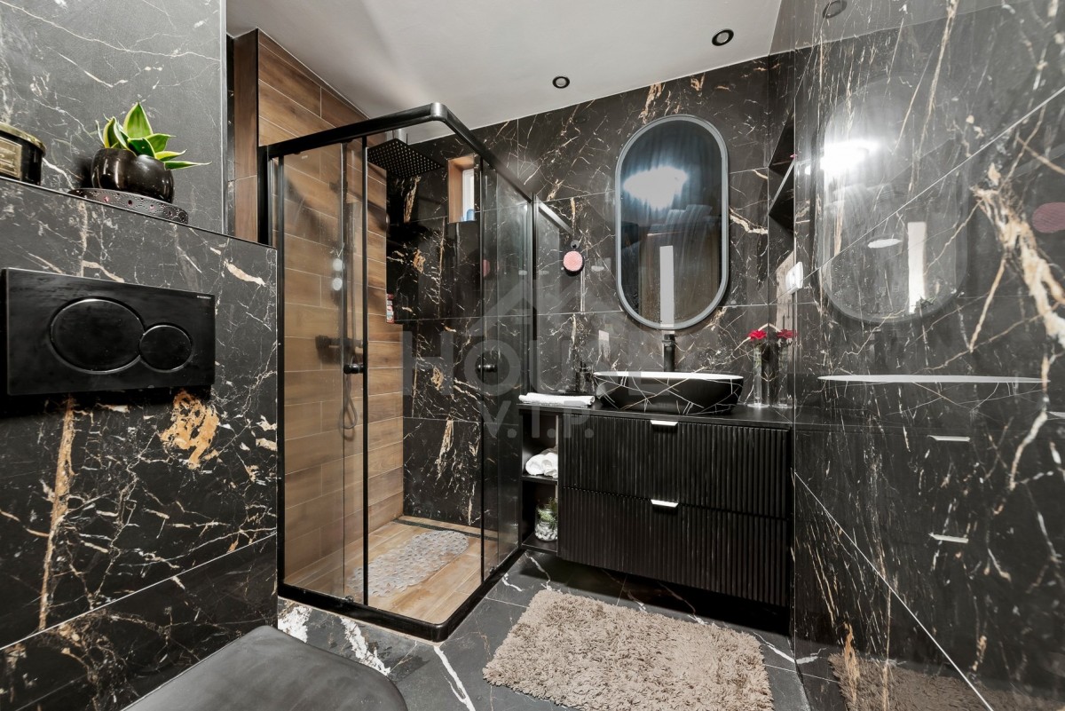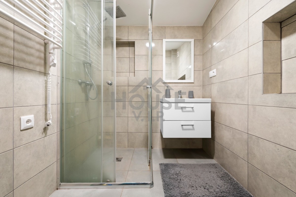 • Spodní patro – prostorné rodinné bydlení s podlahovým vytápěním vodou a koupelnou s elektrickým podlahovým vytápěním.