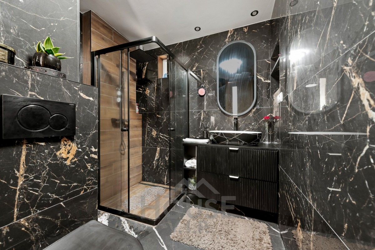• Spodní patro – prostorné rodinné bydlení s podlahovým vytápěním vodou a koupelnou s elektrickým podlahovým vytápěním.