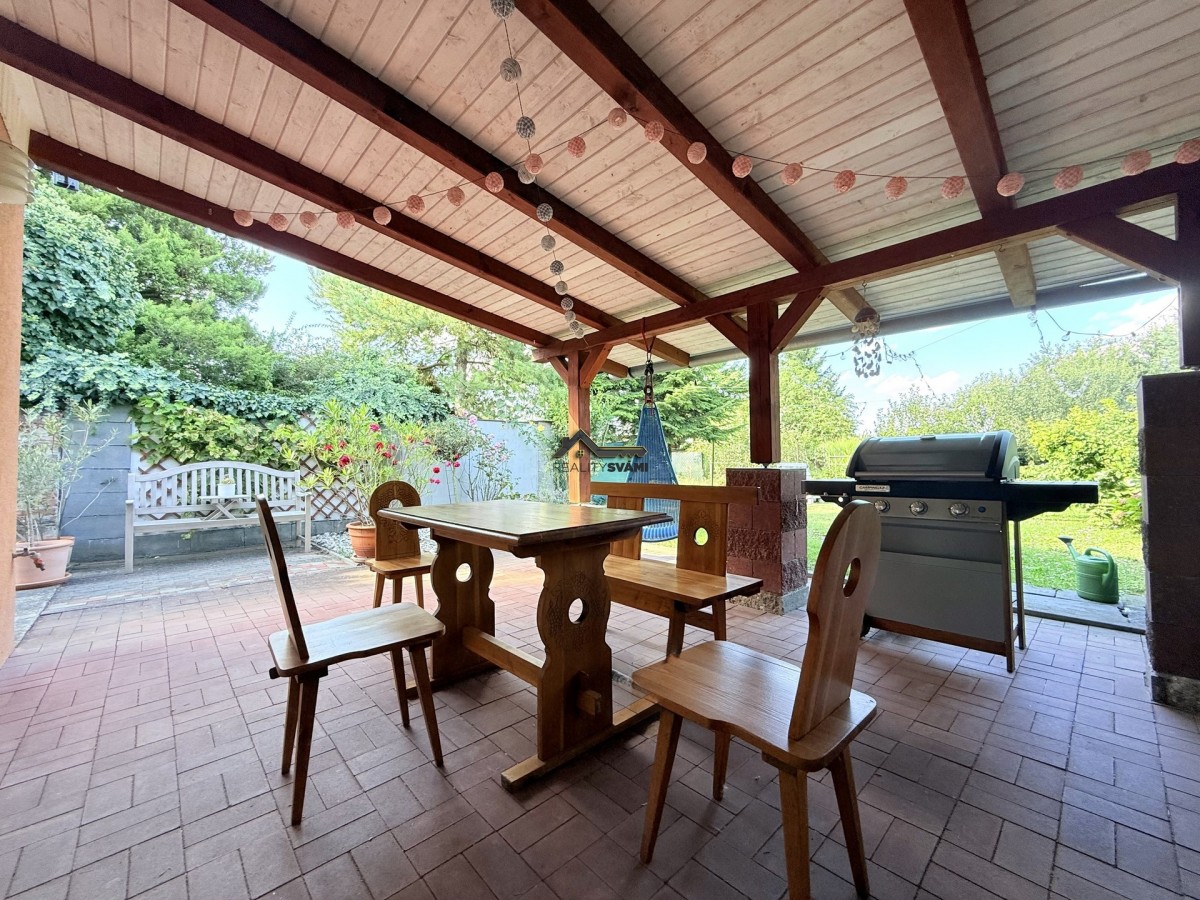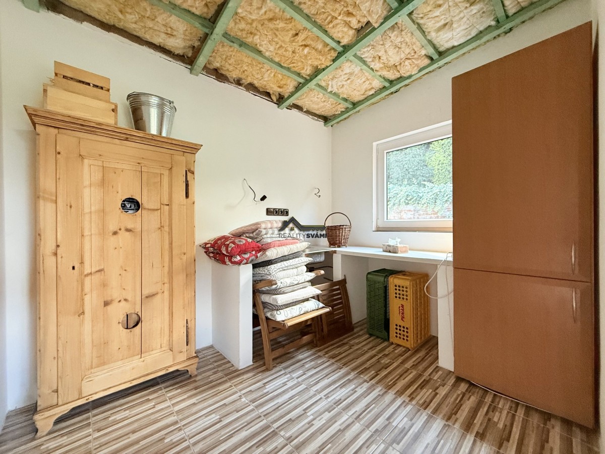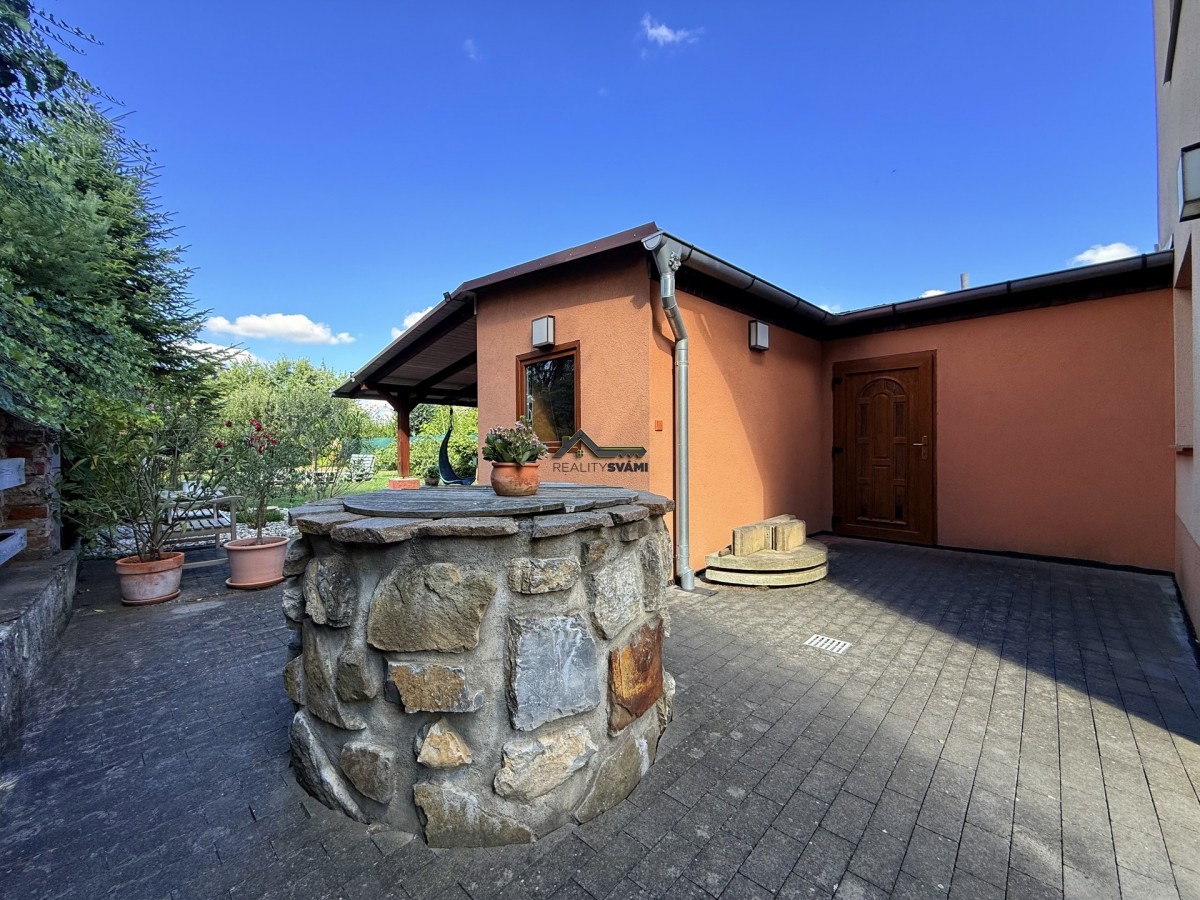Dům je velice útulný, kdy ve spodním patře jsou pokoje, koupelna a sociální zařízení WC a ve vrchním patře otevřený vzdušný obývací pokoj s kuchyňským koutem, samostatná ložnice a nechybí ani zde koupelna a samostatné sociální zařízení WC. Kouzlo bydlení umocňuje přiznání střešních trámů a nádech podkroví ve vrchní části. Zahrada s již zmíněnou venkovní kuchyní a krytým posezením je obrostlá stromy a nabízí klidné posezení. Nechybí ani ovocné stromy, nebo květiny. Své kouzlo má i kamenem obložená studna.