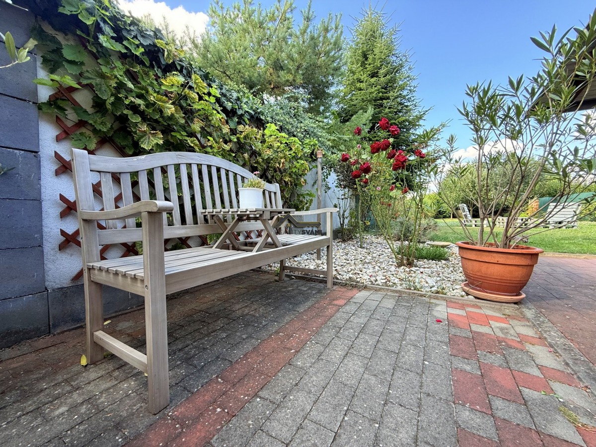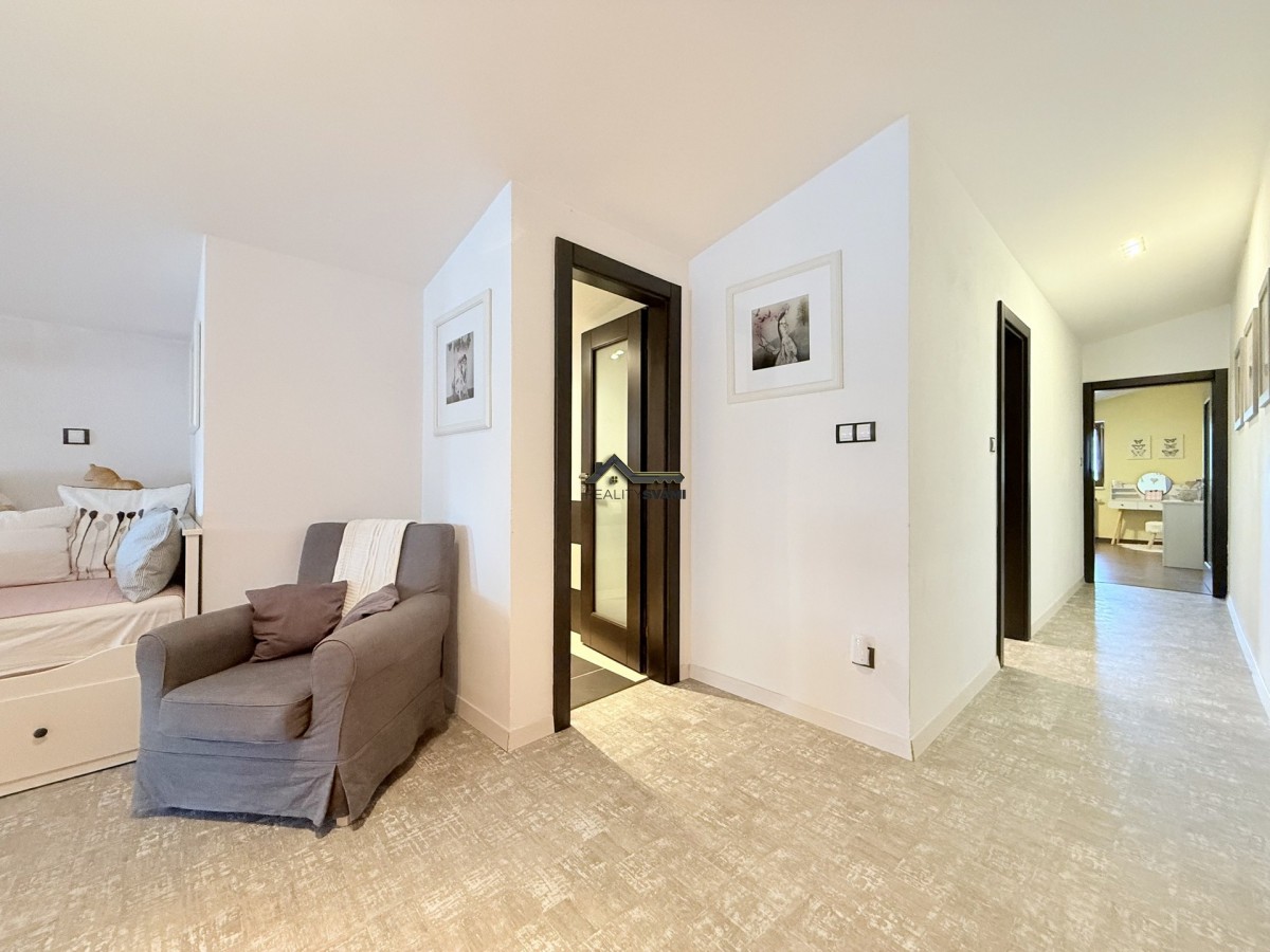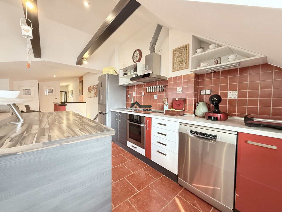 Dům je velice útulný, kdy ve spodním patře jsou pokoje, koupelna a sociální zařízení WC a ve vrchním patře otevřený vzdušný obývací pokoj s kuchyňským koutem, samostatná ložnice a nechybí ani zde koupelna a samostatné sociální zařízení WC. Kouzlo bydlení umocňuje přiznání střešních trámů a nádech podkroví ve vrchní části. Zahrada s již zmíněnou venkovní kuchyní a krytým posezením je obrostlá stromy a nabízí klidné posezení. Nechybí ani ovocné stromy, nebo květiny. Své kouzlo má i kamenem obložená studna.