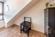 Podkroví - dva pokoje 21 a 10, 5 m2 , koupelna 3, 60 m2 se sprchovým koutem a sociální zařízení WC. Podlahy vinyl. Menší pokoj má vývody na KL, okno do zahrady, větší pokoj a koupelna má střešní okna Velux s trojsklem.