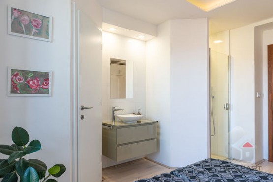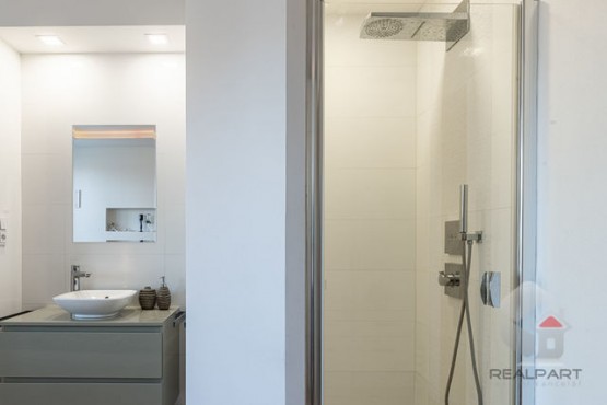 2. NP (druhé nadzemní patro) - obývací prostor 30 m2 s kuchyňskou linkou značky Symerský, spotřebiči Miele, Liebherr. Na podlahách dubové parketová podlaha. Z tohoto prostoru je vstup do ložnice 15 m2 s balkonovými dveřmi směrem na zahradu, na podlaze je dřevo. Přímo v ložnici je designový sprchový kout a samostatné sociální zařízení WC.