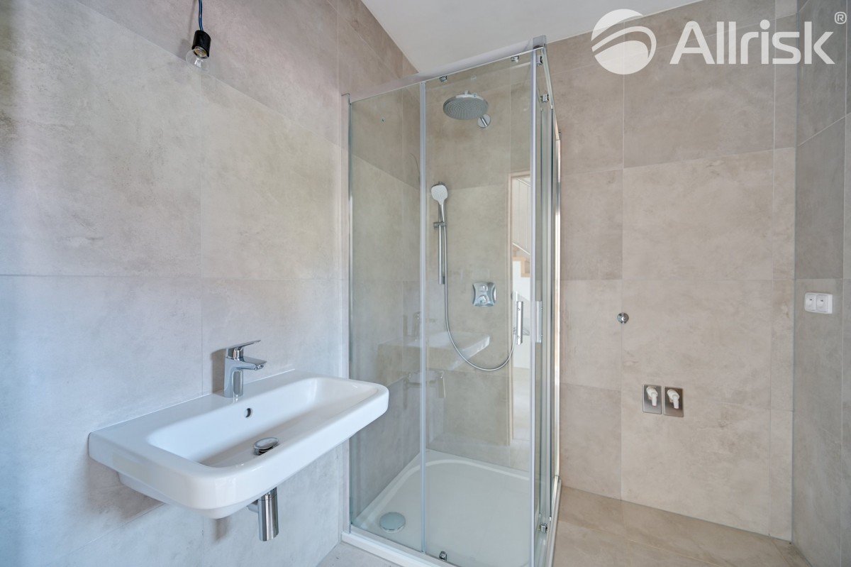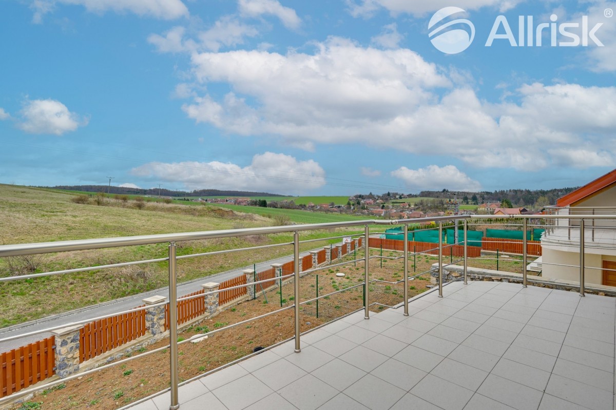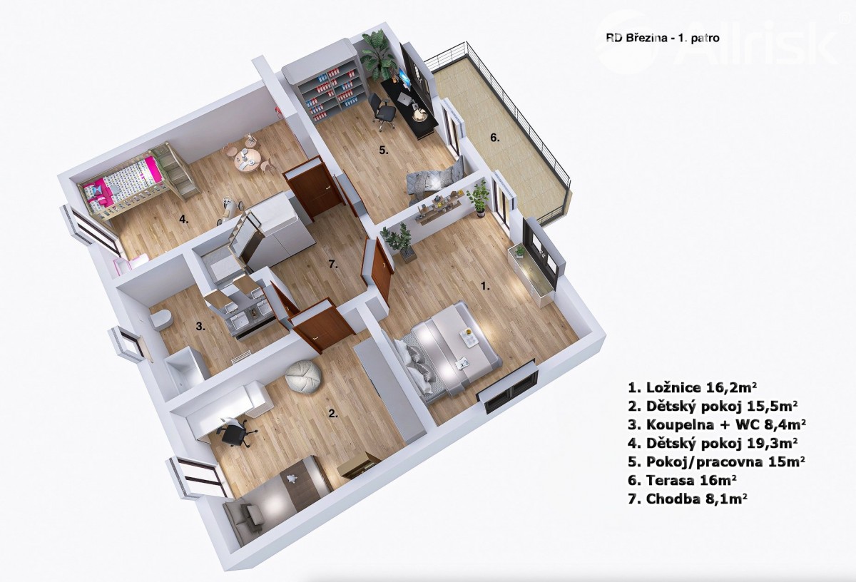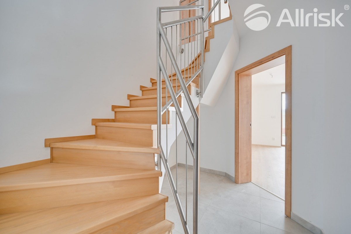 V přízemí domu se nachází... velkorysý prostor obývacího pokoje, který je propojen s kuchyní a vstupem na terasu s moc hezkým výhledem do okolí. Dále je zde koupelna se sprchovým koutem, sociální zařízení WC, technická místnost a prostorná garáž. Dřevěným schodištěm se dostaneme do patra domu, kde najdeme 3 prostorné pokoje se vstupy na terasu a velká koupelna s vanou.