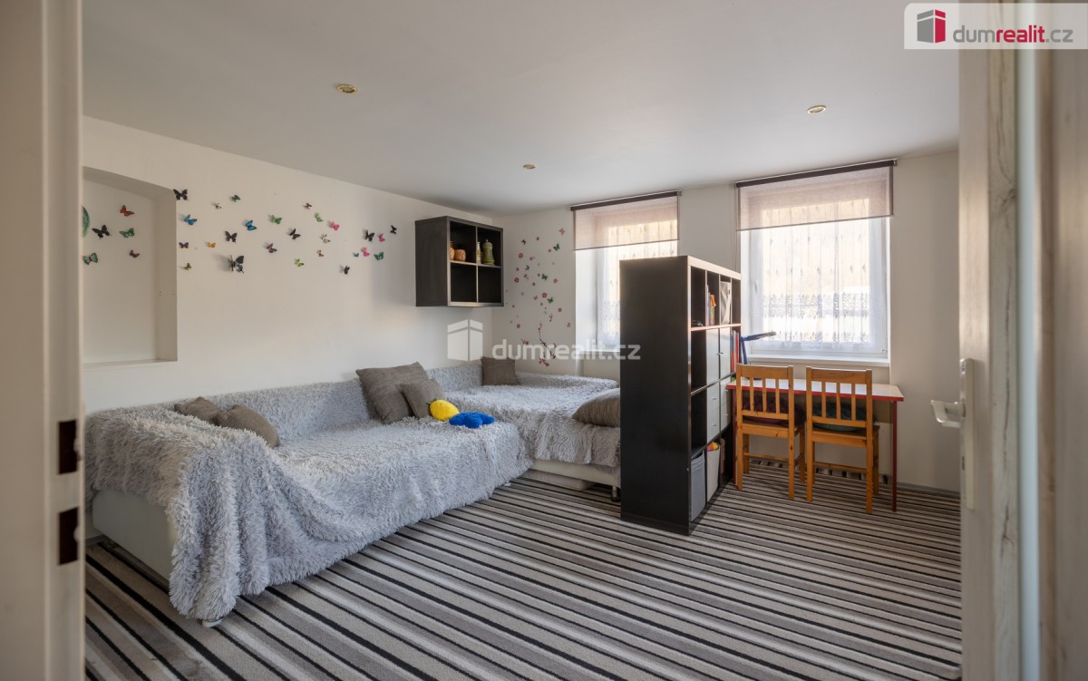 V prvním patře jsou taktéž dva neprůchozí pokoje s velkou spojovací chodbou, dále je zde vchod na půdu domu. Půda je nově (leden 2025) zateplena foukanou izolací, též střecha má novou krytinu (4 roky).