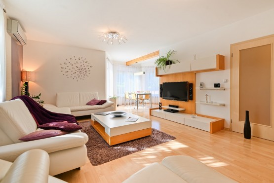 Podlaha – v kuchyni, v chodbách a soc. zázemí – keramická dlažba. V obývacím pokoji, pracovně a pokojích plovoucí podlaha. V ložnici a pokoji pro hosty koberec.