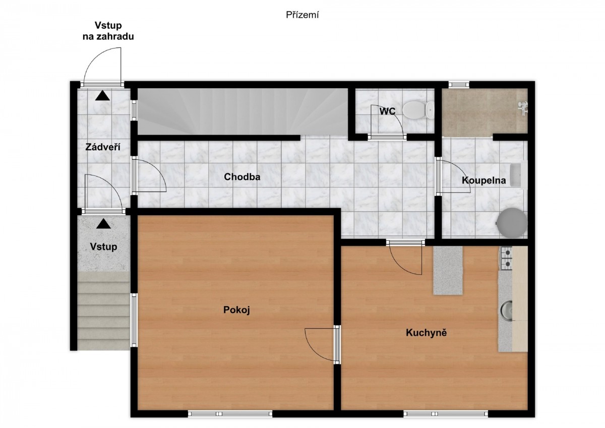 Přízemí: chodba, kuchyně, dva prostorné pokoje a hygienické zázemí