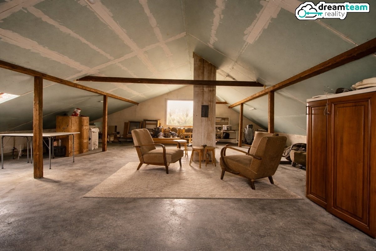 Nový kotel Blaze Harmony na dřevo je investice, na které majitelka nešetřila. A zateplené podkroví s přiznanými trámy a přivedenou elektřinou? Impozantní prázdný prostor, který jen čeká, jestli si z něj uděláte herní centrum, pracovnu nebo třetí bytovou jednotku. Meze se nekladou.