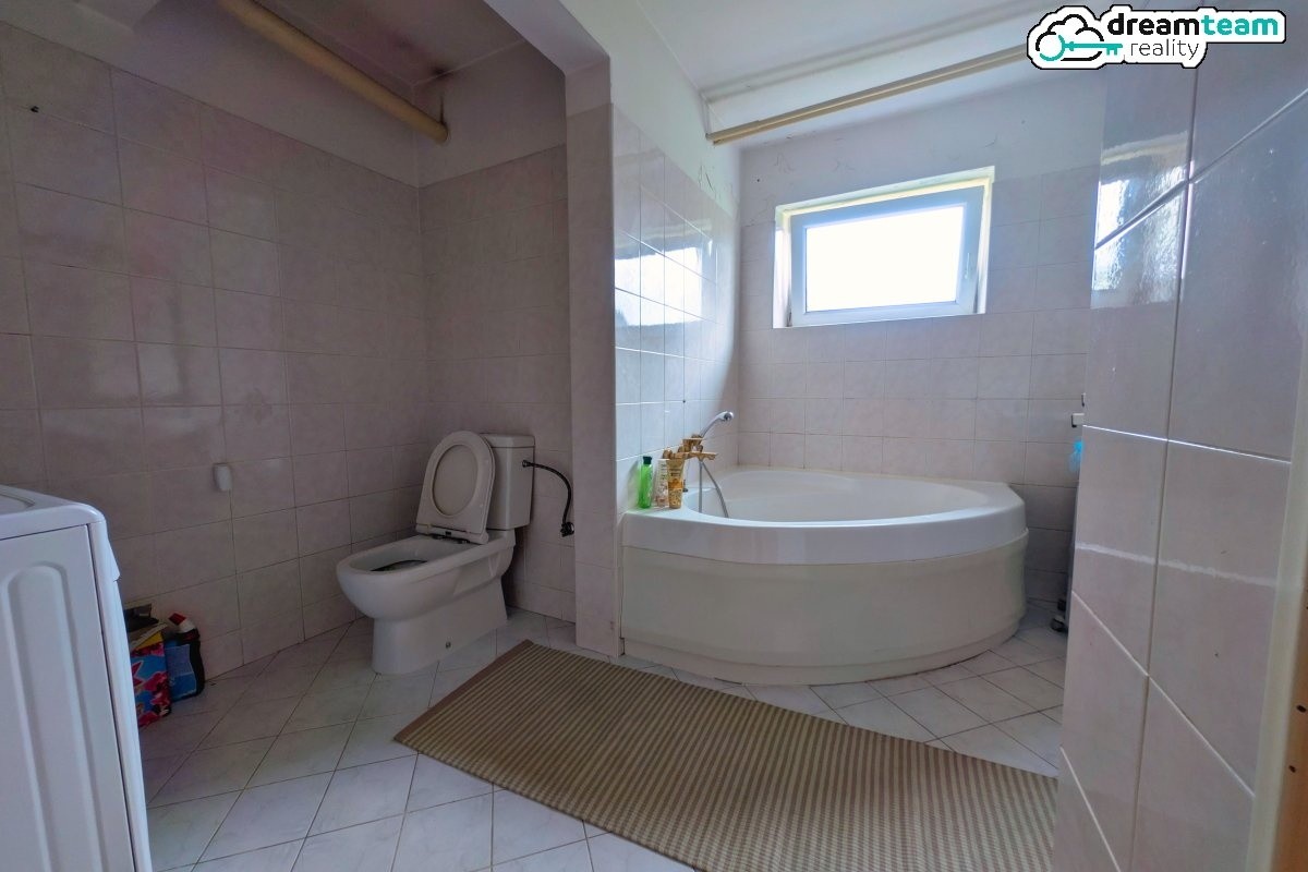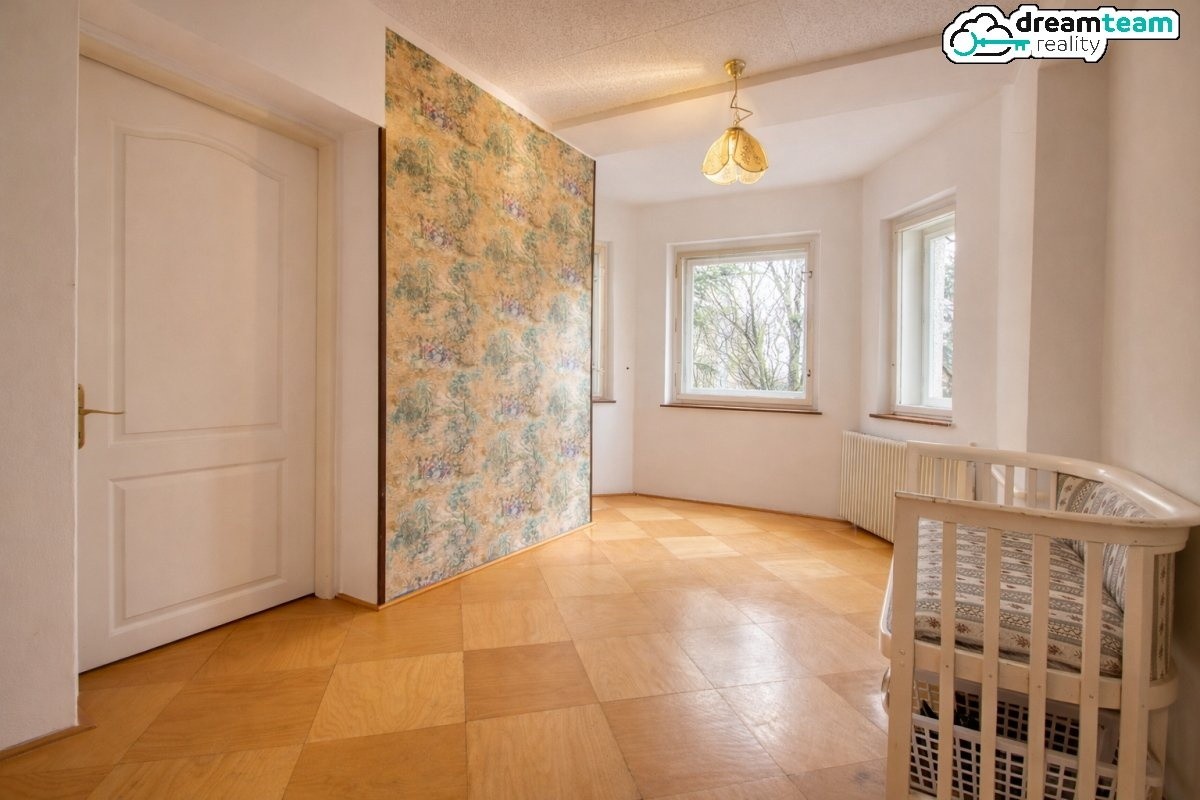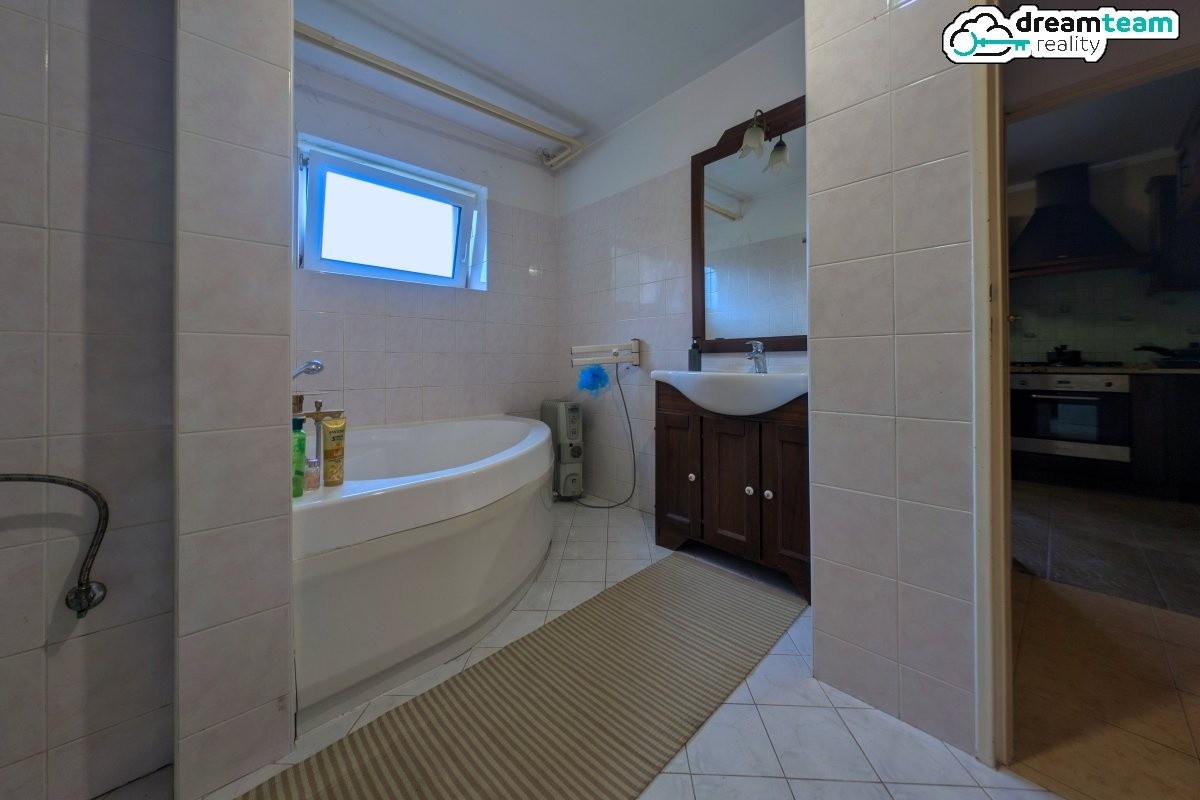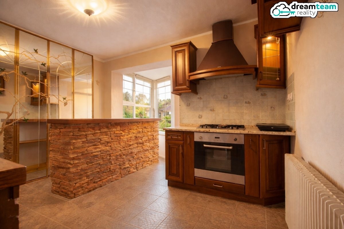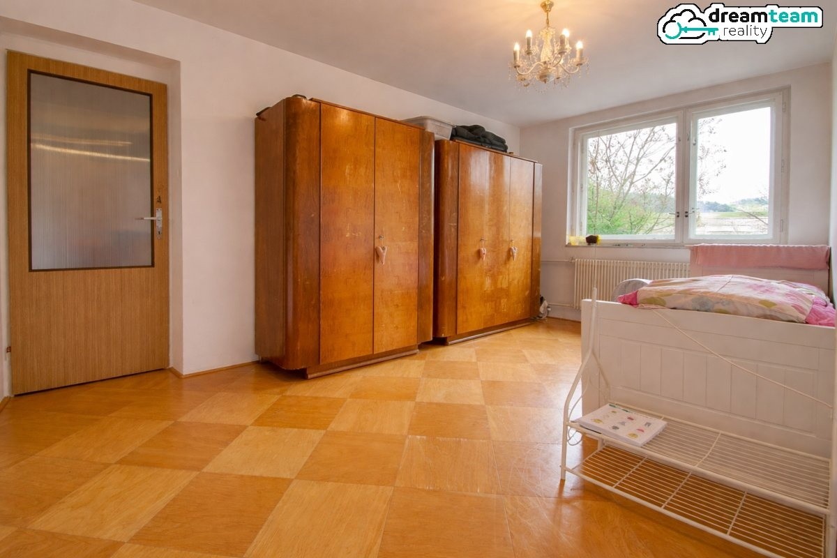 Přízemí je po rekonstrukci — plovoucí podlahy, nová koupelna s rohovou vanou, nové sociální zařízení WC a kuchyň s barem a zrcadlovým panelem, ze které se vychází rovnou na jižní terasu. Tři pokoje. Horní patro nabídne obývák s jídelnou, tři prostorné ložnice s parketami, kuchyni, koupelnu s vanou a balkón na západ. Každá rodina má svůj svět, ale ke společnému obědu mají pár schodů.