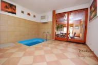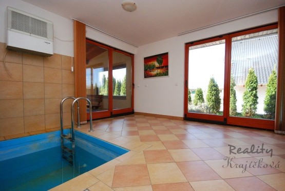 Dispozice domu je následující: vstupní chodba, koupelna s sociální zařízení WC ( sprchový kout, umyvadlo, sociální zařízení WC). Po levé straně je vstup do garáže pro 2 automobily, automatické ovládání vrat a vstup do zahrady. Po pravé straně je vstup do hlavní obytné místnosti a to obývacího pokoje s jídelnou, kuchyňským koutem. V obývacím pokoji dominuje krb pro navození příjemné atmosféry. Masivní kuchyňská linka s barovým pultem je vyrobena na míru s vestavěnými spotřebiči (sklokeramická varná deska, digestoř, trouba, myčka, lednice s mrazákem). Pracovní deska včetně barového pultu je z mramoru. Z kuchyně je vstup do spižírny. Z jídelny je vstup do prostorné společenské místnosti se vstupem na terasu, kde je terasa s pergolou. V přízemí domu se nachází sauna, vnitřní bazén, technická místnost s sociální zařízení WC, sprchovým koutem, umyvadlem, kotlem. Patro disponuje vstupní halou se vstupem do 2 dětských pokojů, ložnice s oddělenou šatnou, místností pro hosty. Každý pokoj má samostatný vstup na balkón s moc hezkým výhledem do zahrady. Na patře je samostatná koupelna s komfortní rohovou vanou, 2 umyvadly, sociální zařízení WC, bidetem.