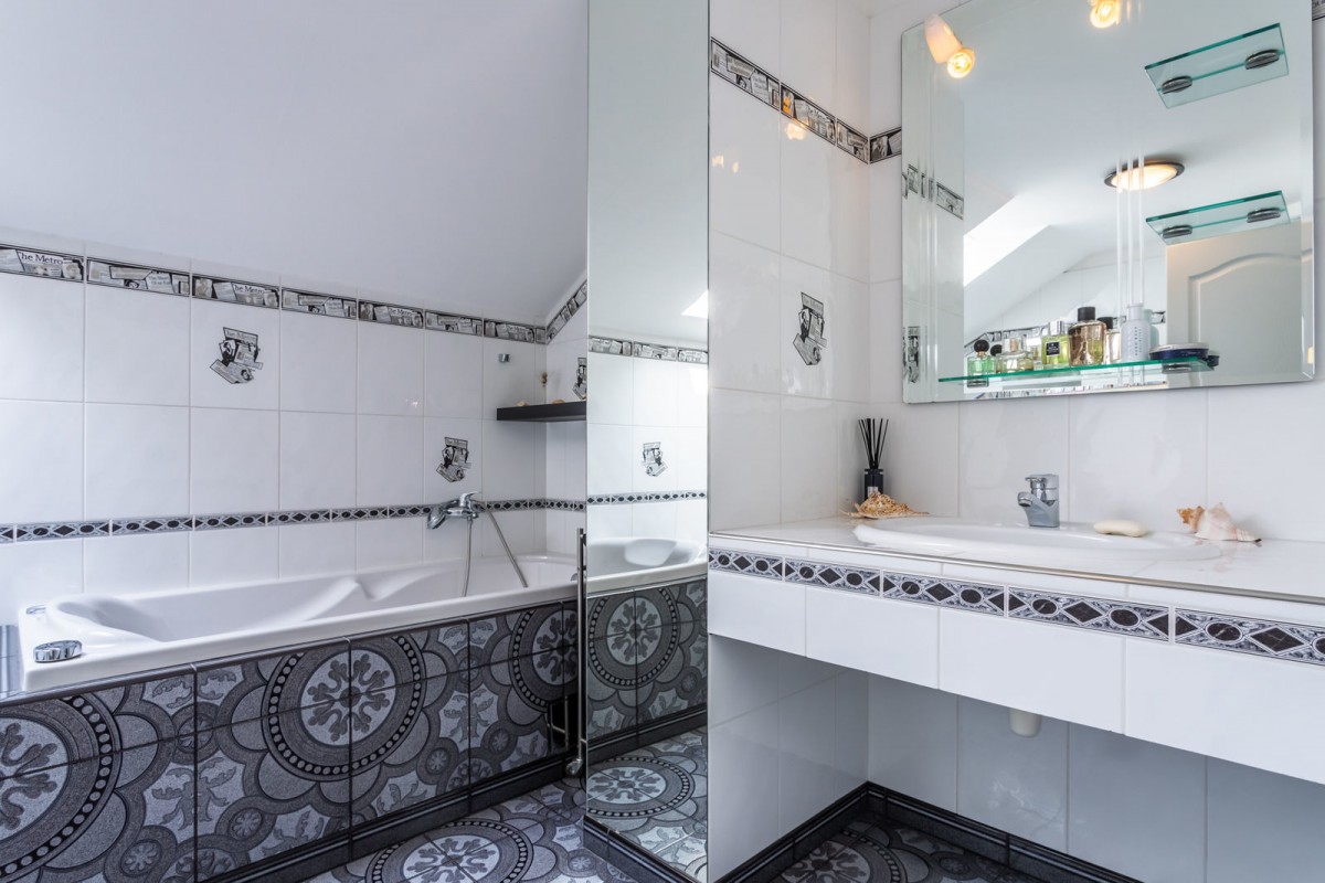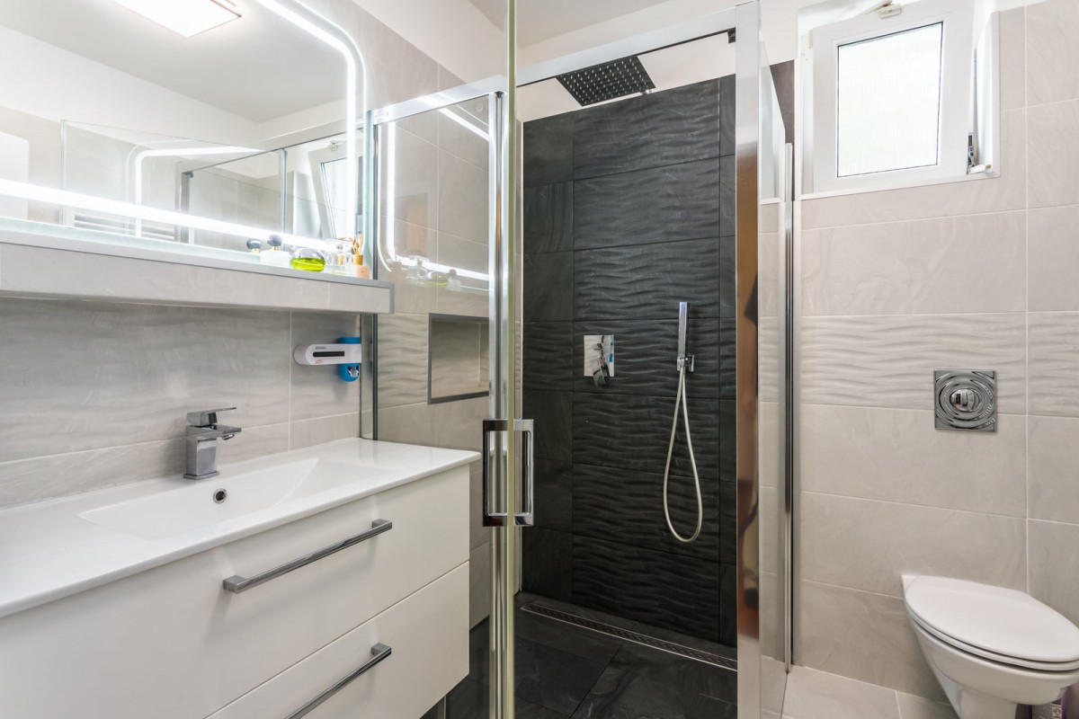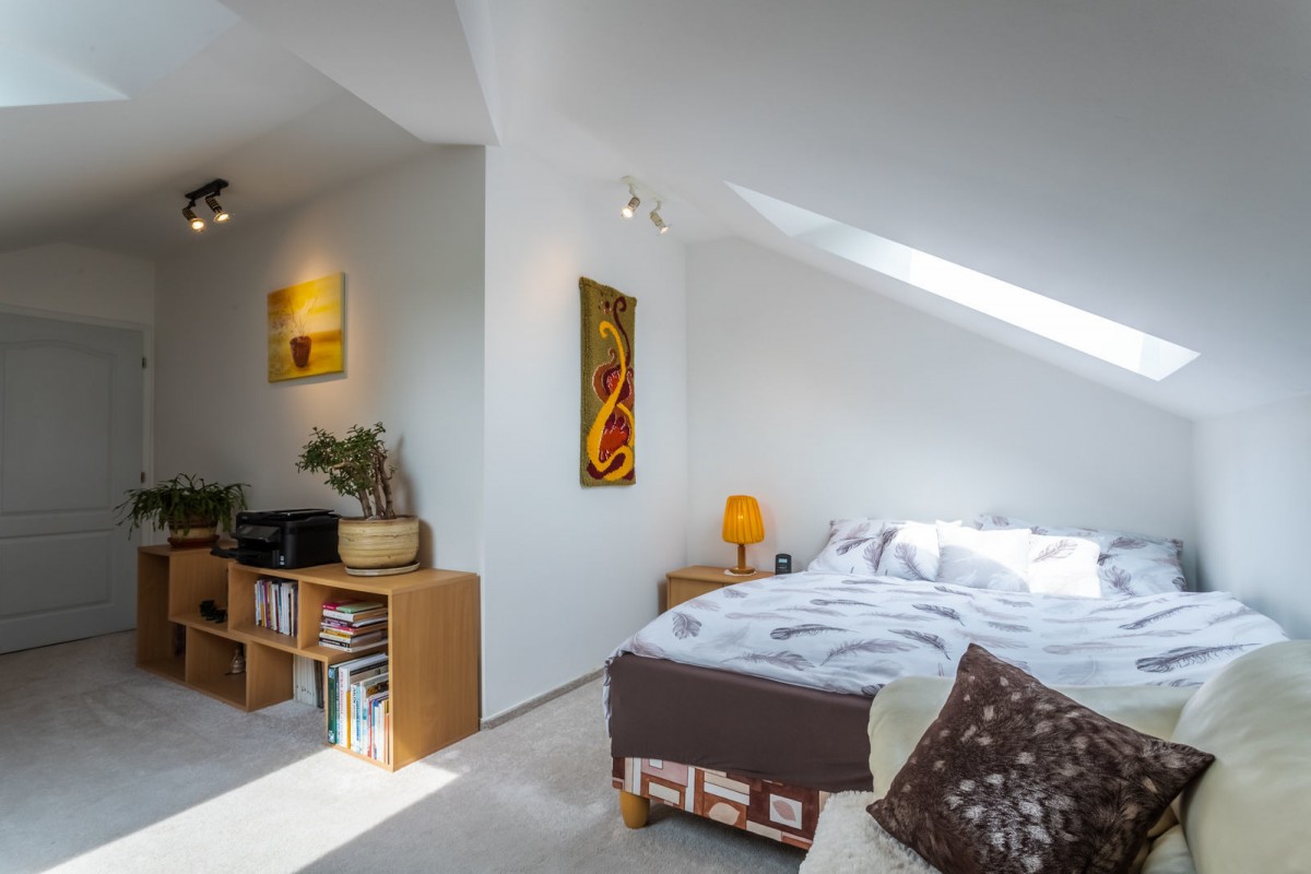 Po schodišti vstupujeme do 2. NP (druhé nadzemní patro), konkrétně do spojovací chodby, na kterou navazuje prostorná ložnice, druhá koupelna s masážní vanou a toaletou. Dále zde najdeme 3 prostorné pokoje, poskytující dostatek prostoru. Celý dům již na první dojem působí velice útulně. To je díky použití kvalitních materiálů a řemeslného zpracování. Pokud se vrátíme do 1. NP (první nadzemní patro), můžeme z obývacího pokoje vstoupit na menší terasu a zahradu. Trávení času na této udržované okrasné zahradě vám jistě zpříjemní pergola se zděným grilem a udírnou, kde lze strávit nejeden příjemný večer. Na samotném pozemku je i podzemní sklep.