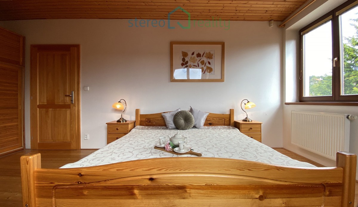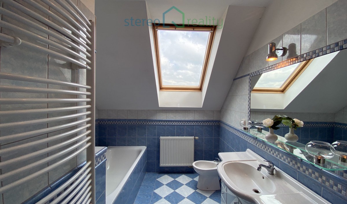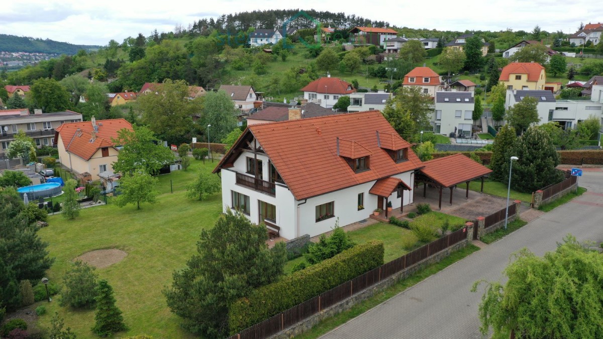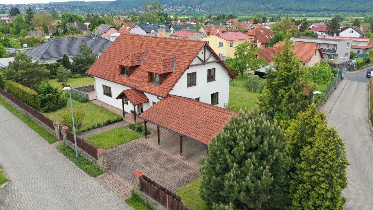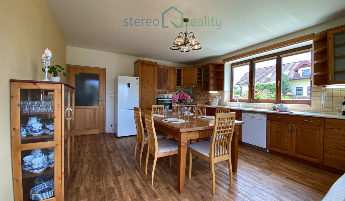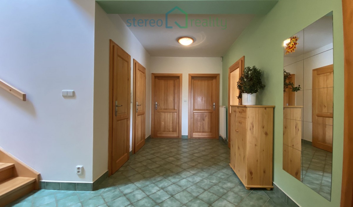 Velkorysé dispoziční řešení tohoto rodinného domu nabízí 2 nadzemní podlaží. V přízemí je k dispozici velká světlá kuchyně s jídelním stolem a východem na venkovní terasu a zahradu, dále obývací pokoj, šatna, pokoj využívaný jako pracovna, koupelna se sprchovým koutem a bidetem, samostatné sociální zařízení WC, vstupní předsíň, hala, prádelna a sklad. Po schodišti se stropním oknem je možné vystoupat do horního patra, které nabízí dva samostatné pokoje s východy na širokou lodžii, pracovnu, další dva samostatné pokoje, prostornou koupelnu s vanou a samostatné sociální zařízení WC. Dům je také částečně podsklepený (technická místnost a sklad 20, 3 m2).
