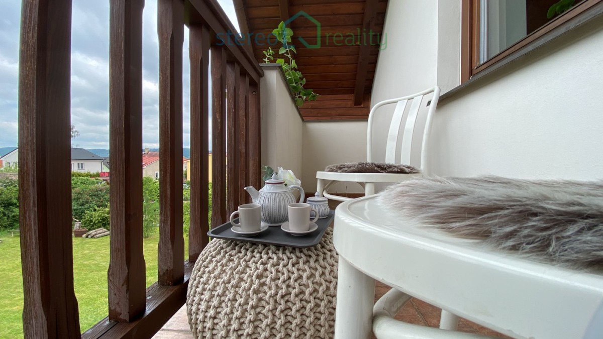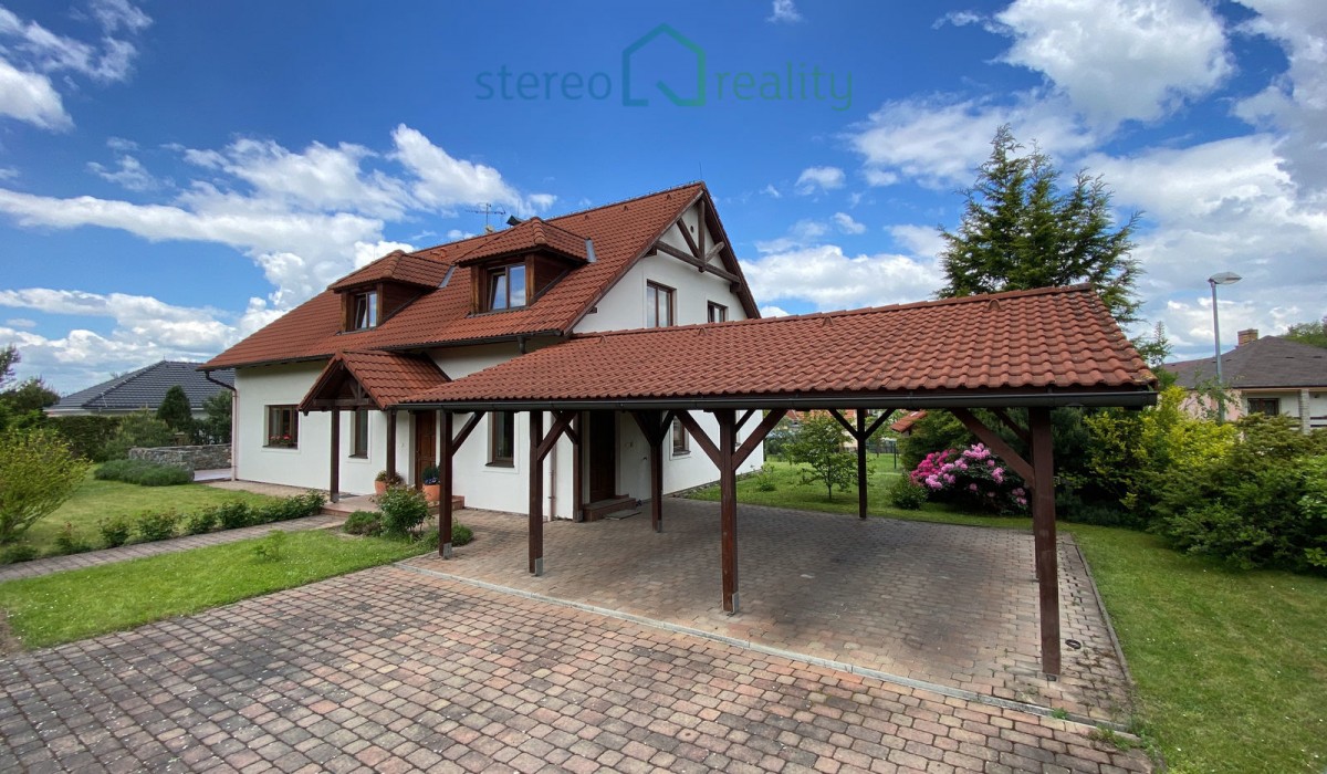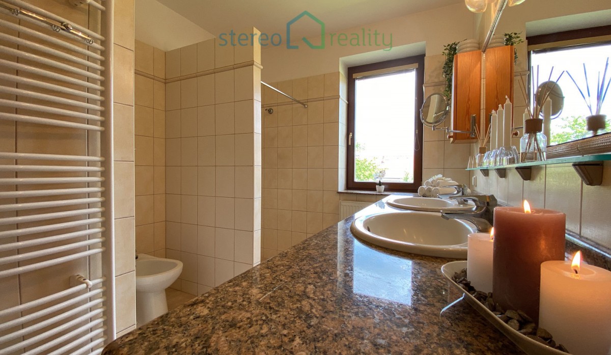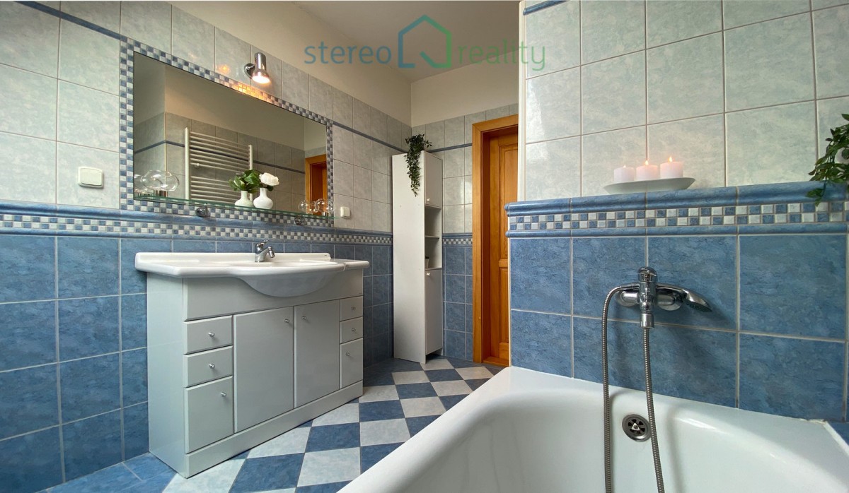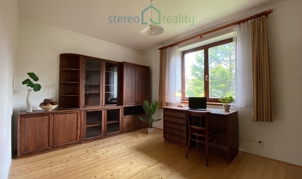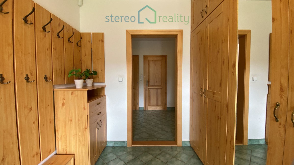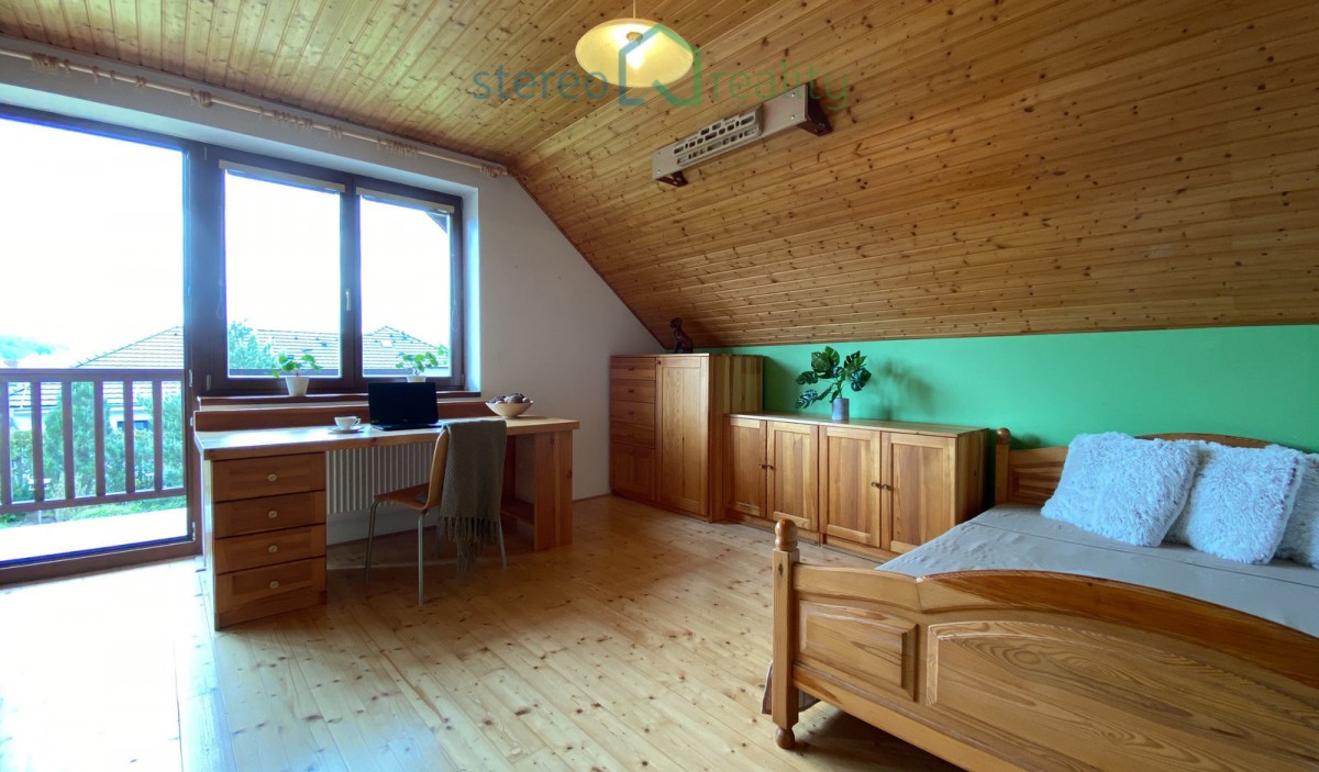 Velkorysé dispoziční řešení tohoto rodinného domu nabízí 2 nadzemní podlaží. V přízemí je k dispozici velká světlá kuchyně s jídelním stolem a východem na venkovní terasu a zahradu, dále obývací pokoj, šatna, pokoj využívaný jako pracovna, koupelna se sprchovým koutem a bidetem, samostatné sociální zařízení WC, vstupní předsíň, hala, prádelna a sklad. Po schodišti se stropním oknem je možné vystoupat do horního patra, které nabízí dva samostatné pokoje s východy na širokou lodžii, pracovnu, další dva samostatné pokoje, prostornou koupelnu s vanou a samostatné sociální zařízení WC. Dům je také částečně podsklepený (technická místnost a sklad 20, 3 m2).