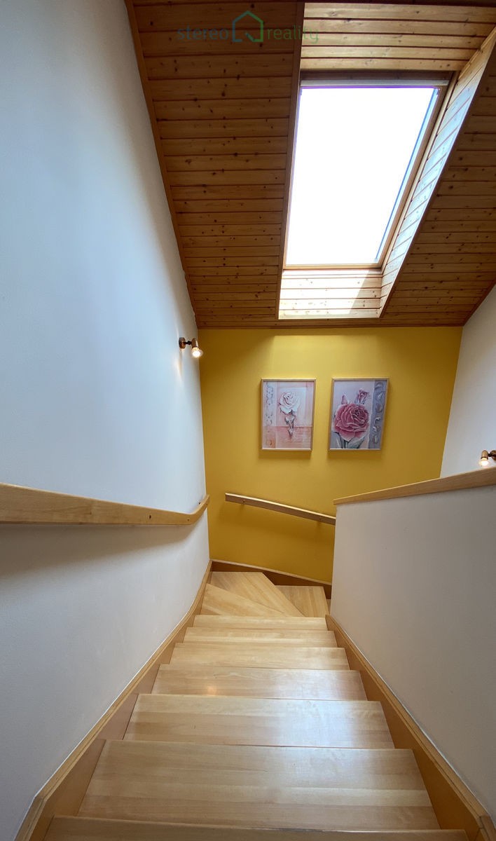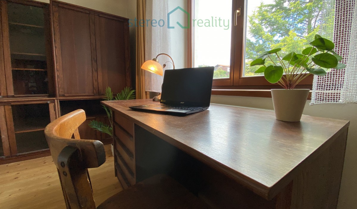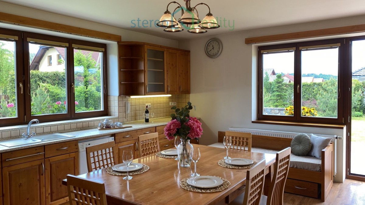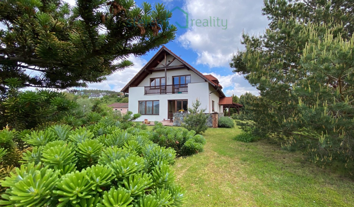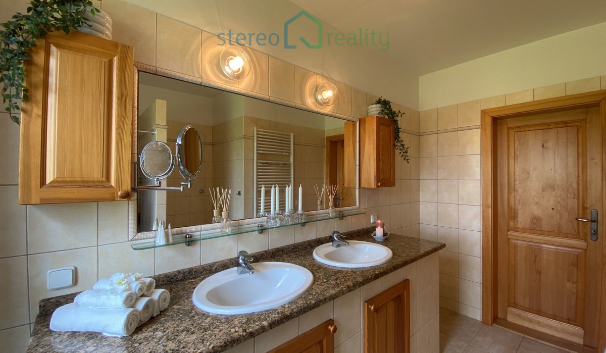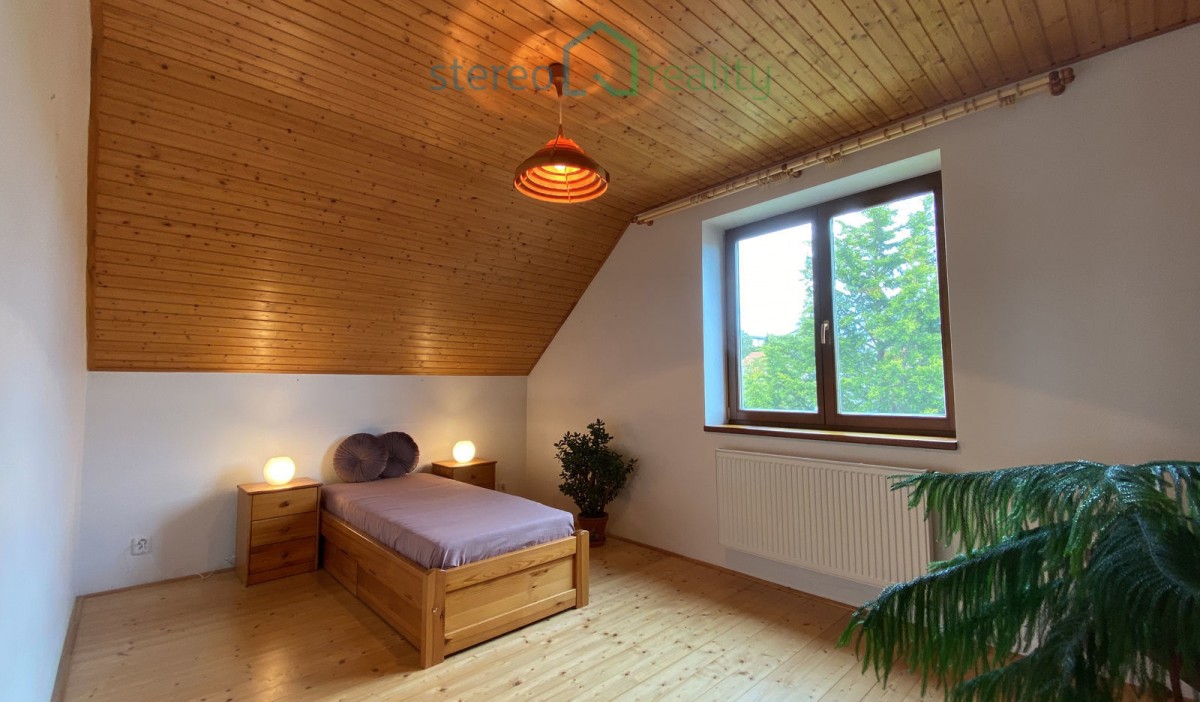 Velkorysé dispoziční řešení tohoto rodinného domu nabízí 2 nadzemní podlaží. V přízemí je k dispozici velká světlá kuchyně s jídelním stolem a východem na venkovní terasu a zahradu, dále obývací pokoj, šatna, pokoj využívaný jako pracovna, koupelna se sprchovým koutem a bidetem, samostatné sociální zařízení WC, vstupní předsíň, hala, prádelna a sklad. Po schodišti se stropním oknem je možné vystoupat do horního patra, které nabízí dva samostatné pokoje s východy na širokou lodžii, pracovnu, další dva samostatné pokoje, prostornou koupelnu s vanou a samostatné sociální zařízení WC. Dům je také částečně podsklepený (technická místnost a sklad 20, 3 m2).