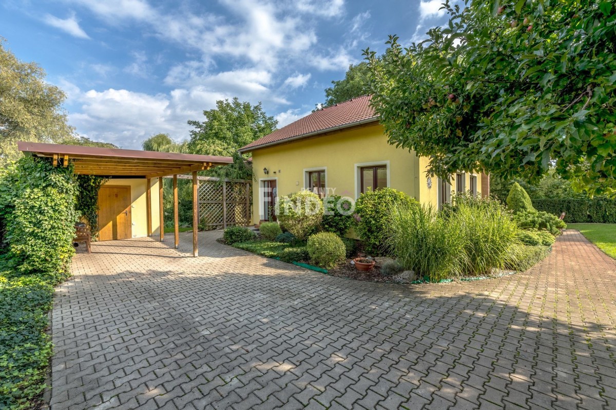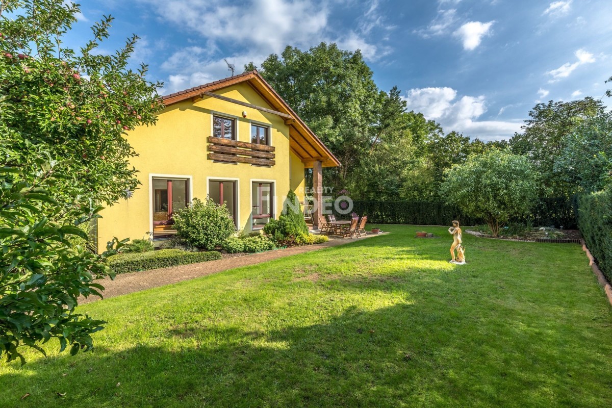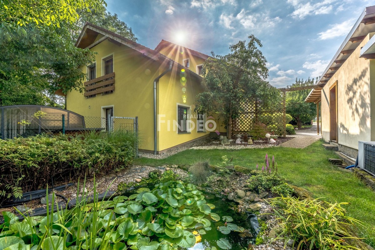A pak tu máme udržovanou zahradu s přírodním jezírkem, podsklepený zahradní domek, který slouží na skladování různého nářadí, sklípek pak ke skladování dobrého vína. Zastřešený, vyhřívaný bazén o rozměru 3, 5m2 x 7m2 s protiproudem, UV lampou zajišťující automatickou desinfekcí vody a pískovou filtrací, vám umožní příjemný relax po celodenní námaze, zastřešené parkovací stání.