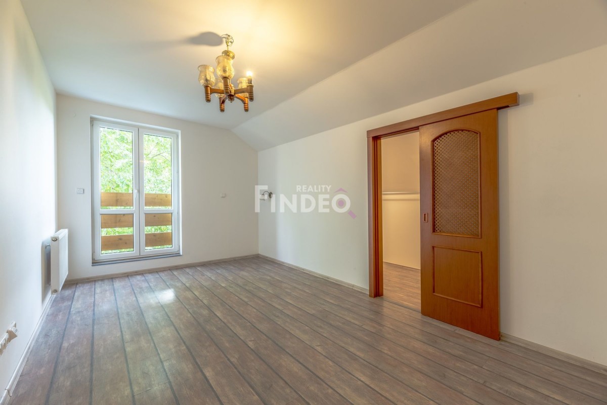 První patro nabízí dva prostorné pokoje s vlastní šatnou vybavenou vestavěnými skříněmi, koupelnu s hydromasážní vanou, umyvadlem, toaletou a bidetem, dále pak technickou místnost s přívody na pračku popř. sušičku.