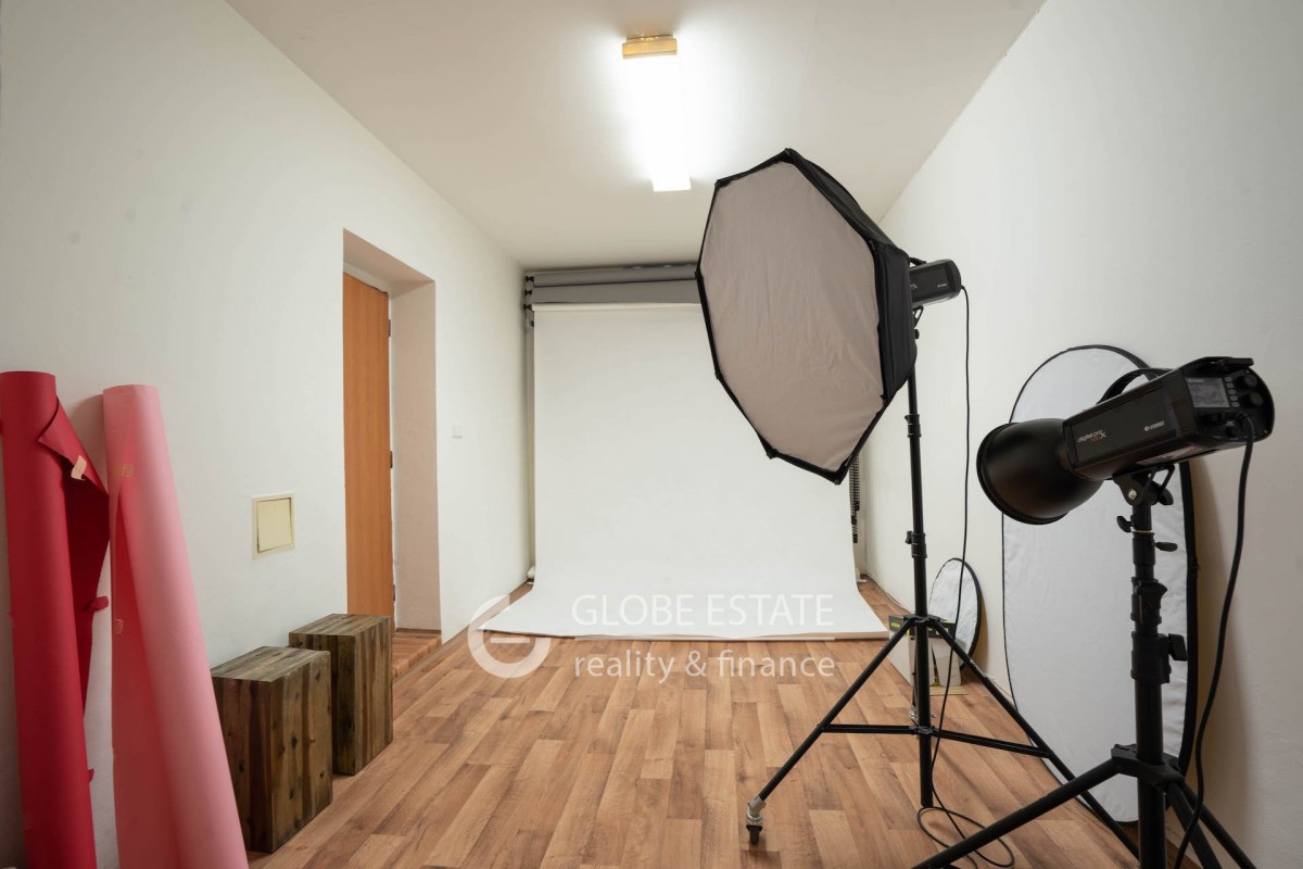 Začneme v přízemí, které se dá využít jako samostatný byt se vstupem ze zahrady. Je tu sauna se sprchou a záchodem, dále místnost s kuchyňskou linkou a další obytná místnost.