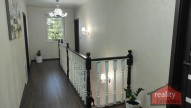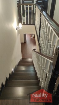 Po moc hezkém masivním schodišti vystoupáte do patra na prostornou chodbu s jednotlivými vstupy, a to do prostorné koupelny s rohovou vanou, 2 krát umyvadlem, toaletou i bidetem (14, 24), tří pokojů (14, 70m2 se vstupem na balkon, 16, 59m2 a 17, 40m2), ložnice (16m2) a pokoje - nyní šatny (12, 85m2).