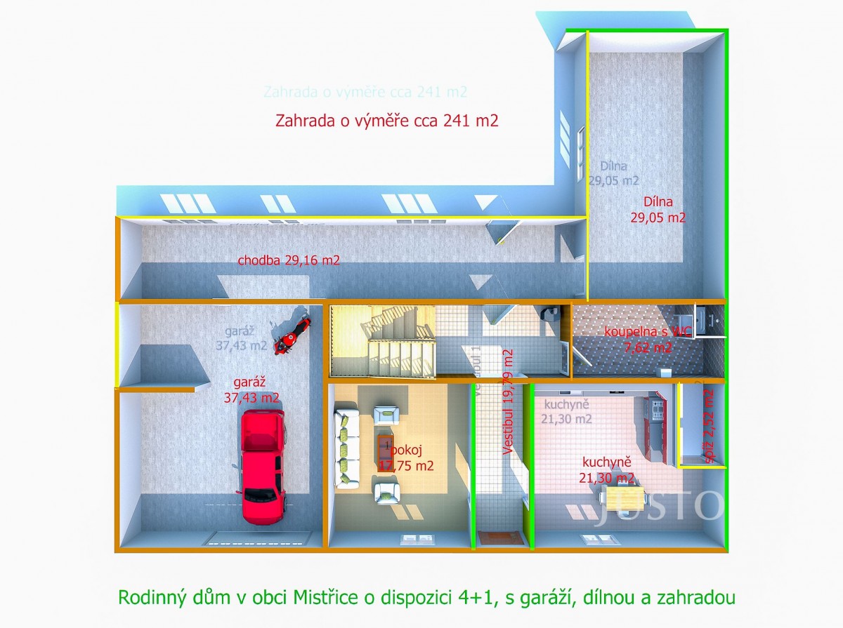 Celková užitná plocha domu je 254, 19 m² včetně garáže a dílny. Zastavěná plocha domu je cca 196 m², zahrada je cca 241 m².