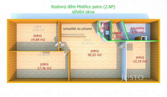 V prvním patře jsou prostory rozděleny na velký pokoj - halu, tři pokoje, koupelnu v přípravě a samostatné sociální zařízení WC s umyvadlem.