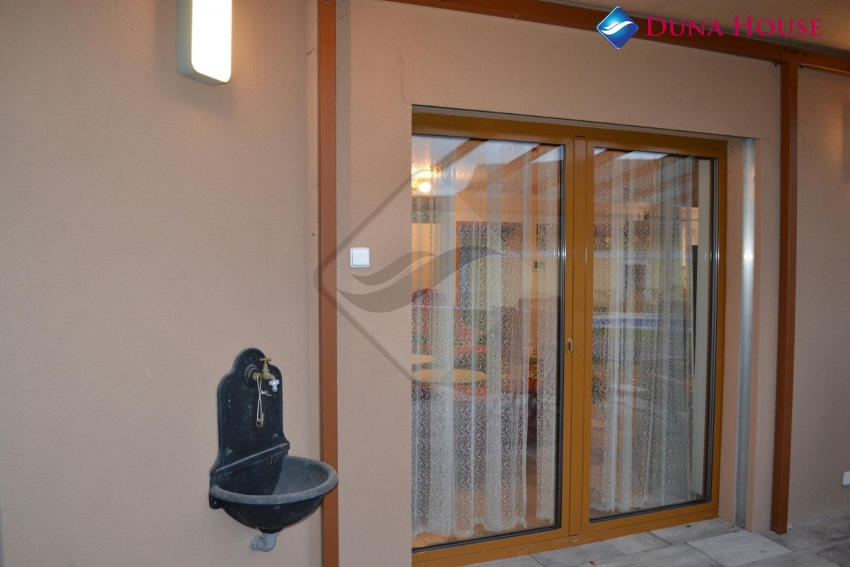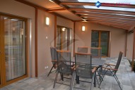 Z obývacího pokoje se můžeme dostat na terasu, která je krytá bezpečnostním sklem Connex. Terasa dopřává výhled na zahradu s bazénem o rozměru 7 krát 3 krát 1, 5 se slanou vodou. Dále je na zahradě postaven zahradní domek s velkým odděleným prostorem využitelný například pro skladování věcí.