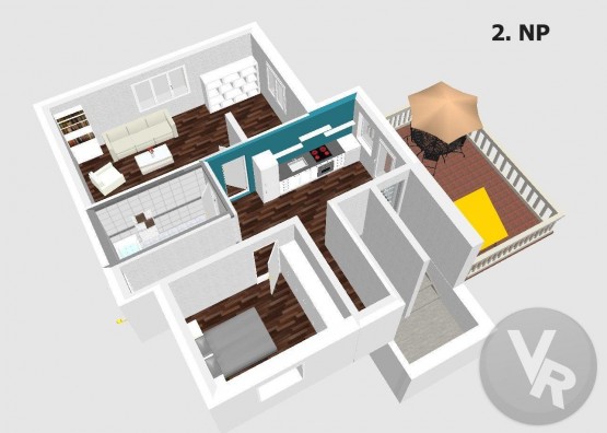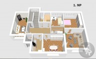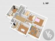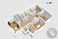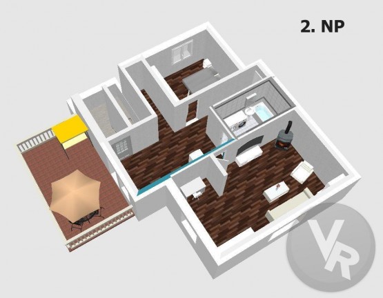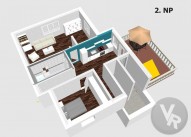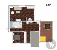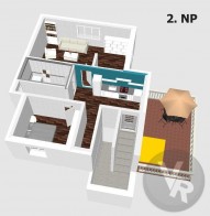 2. NP (druhé nadzemní patro) kuchyň 14, 2 m2 ze které je vstup na velkou terasu s nádherným výhledem o velikosti 21 m2; komora 2, 8 m2; ložnice 11 m2; obývací pokoj 27, 4 m2; koupelna 5, 8 m2 a chodba do půdních prostor 5, 8 m2. Z půdy o rozměru 101 m2 je možné vybudovat další prostornou mezonetovou jednotku.