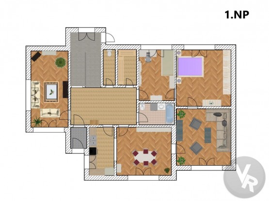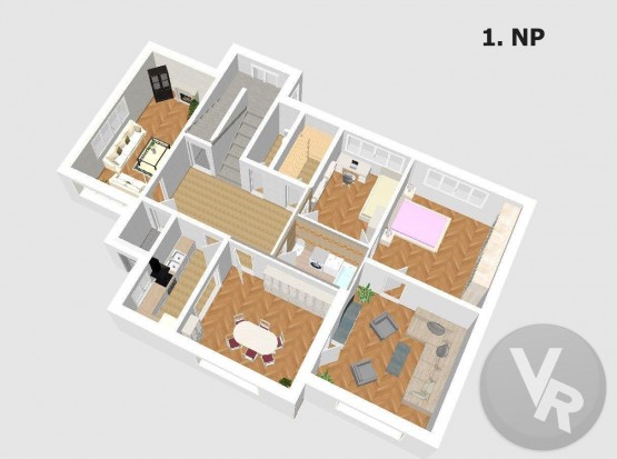 1. NP (první nadzemní patro) vstup 2, 21 m2; hale se schodištěm 15, 9 m2; pokoj s krbem 18, 45; kuchyň 7, 74 m2; jídelna 16, 7 m2; obývací pokoj 20 m2; ložnice 20 m2; druhá ložnice 12 m2; koupelna s vanou a toaletou 5m2; spíž 4 m2 a samostatná toaleta 2, 5 m2
