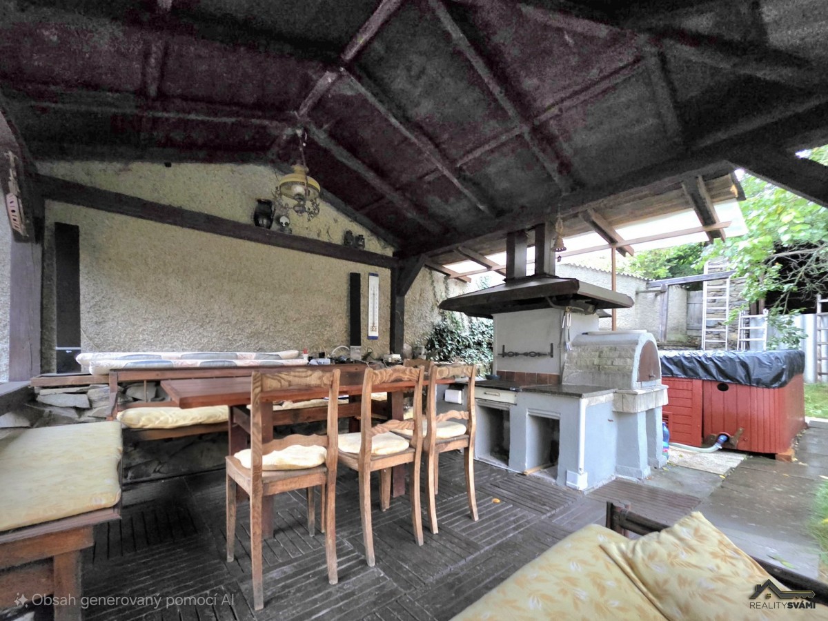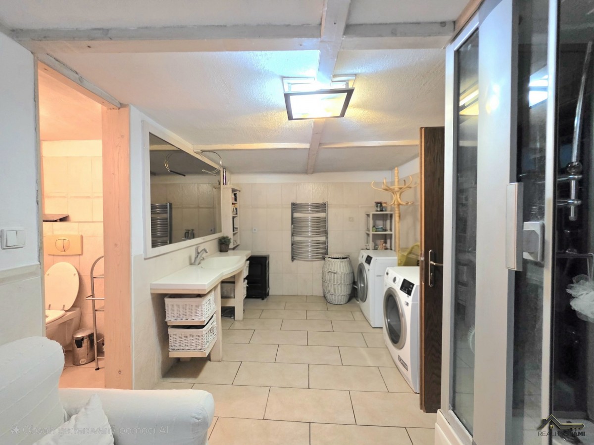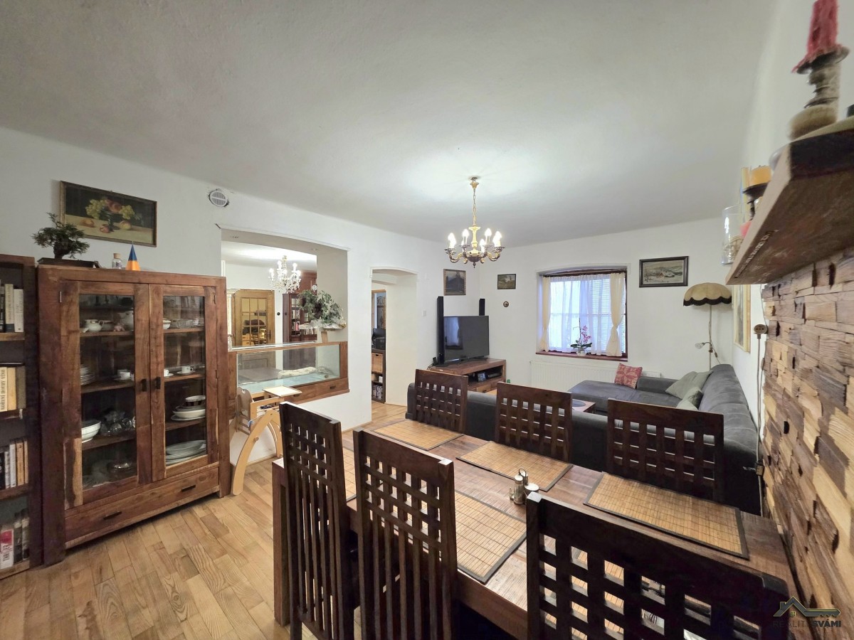 Přízemí kompletně rekonstruováno, obyvatelné a ve velice dobrém stavu, dispozice: předsíň, společenská místnost s krbem průchozí ze dvou stran, z pravé strany přes ložnici, z levé strany propojená s obývacím pokojem a jídelnou, zde jsou dveře do garáže. Dále se přes obývací pokoj s jídelnou dostanete do prostorné