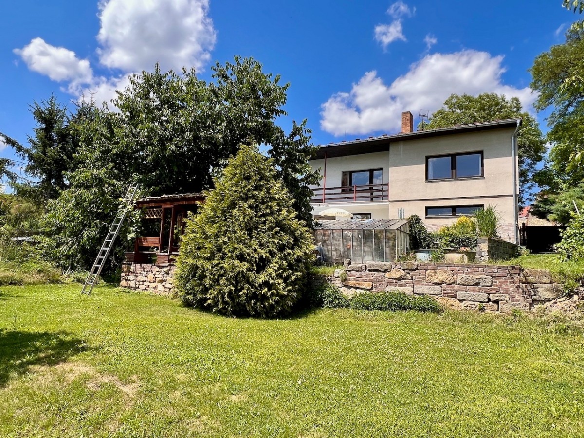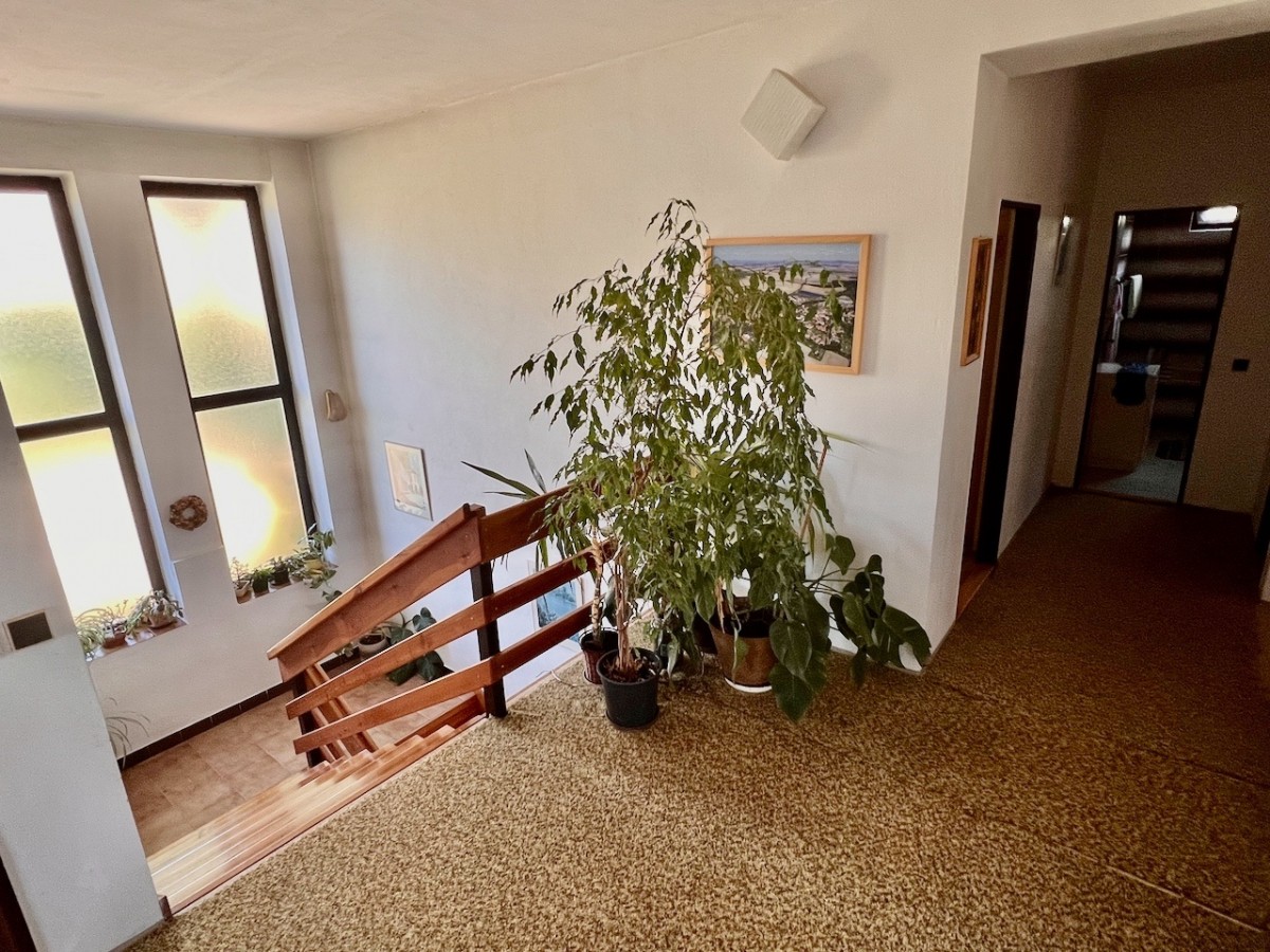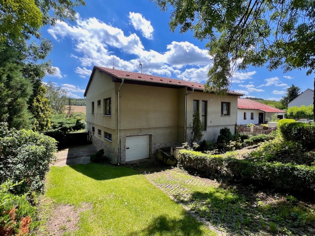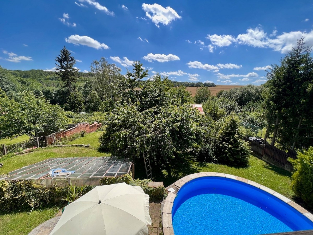 V prvním patře domu je skvěle dispozičně řešený byt 5+1 s velkorysým obývacím pokojem s balkonem. V příz...emí domu je zázemí, v kterém je možné vybudovat menší bytovou jednotku. Celý dům má ústřední topení, které lze vytápět automatickým kotlem na uhlí, nebo plynovým kotlem. Voda z vlastní studny, nebo z obecního vodovodu. Lehce svažitý jižní pozemek o velikosti 1625 m2. Na pozemku najdeme příjemnou terasu s bazénem, pergolu i zděnou kolnu. Dům je skvěle udržován. Pokud hledáte rodinný dům s velkým pozemkem, doporučuji prohlídku.