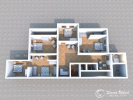 V patře se nachází chodba, 5 pokojů, koupelna, sociální zařízení WC a několik skladových a úložných prostor.