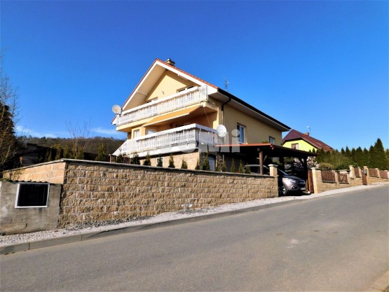 Zděný dům zkolaudovaný v roce 2004 má zastavěn...ou plochu 151 m2 a přibližnou užitnou plochu 273 m2. Dispozice jsou rozděleny do tří podlaží: v suterénu je garáž a technická místnost s centrálním vysavačem pro celý dům. V přízemí je předsíň, kotelna, kuchyně s jídelnou, obývací pokoj a pracovna, samostatná koupelna, toaleta a venkovní terasa propojená se zahradou. Po dřevěném schodišti se vystupuje do obytného podkroví, kde se nacházejí tři prostorné ložnice (ze dvou se vchází na balkon, ze třetí na horní venkovní terasu) a koupelna s vanou , sprchovým koutem a oddělenou komorou. Balkon i terasy umožňují široký rozhled do okolí. Pod střechou je úložný půdní prostor. Dům je napojen na veřejné sítě, ústřední vytápění je řešeno plynovým kotlem nebo krbovými kamny s rozvody i do podkrovních pokojů. Ohřev vody zajišťuje elektrický bojler. Vestavěný nábytek v místnostech je součástí prodeje stejně jako kuchyňská linka se spotřebiči.