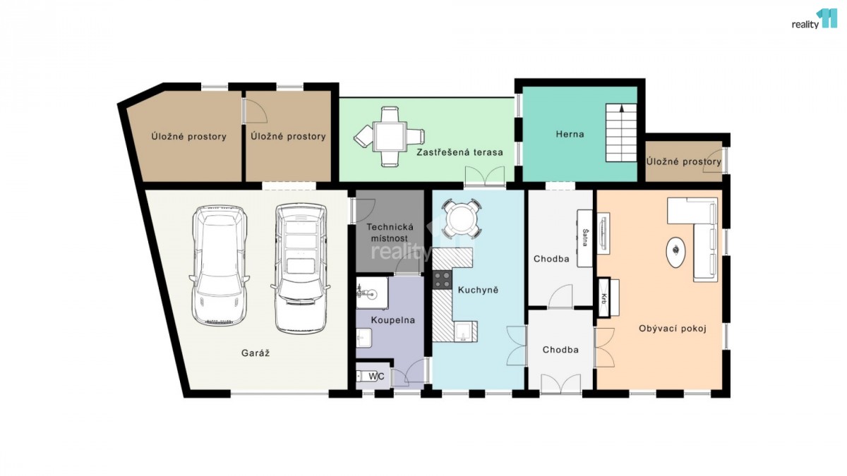 • Prostorná hala, kterou lze přestavět na další pokoj