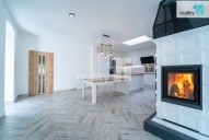 V levé části přízemí se pak nachází velká koupelna s toaletou, dvěma umyvadly a sprchovým koutem. Velkorysý prostor kuchyně s novými vestavěnými spotřebiči a plynule navazující obývací pokoj s kachlovými kamny. Tento prostor je zároveň vytápěn podlahovým topením. Z tohoto prostoru lze vstoupit na terasu a následně na zahradu.