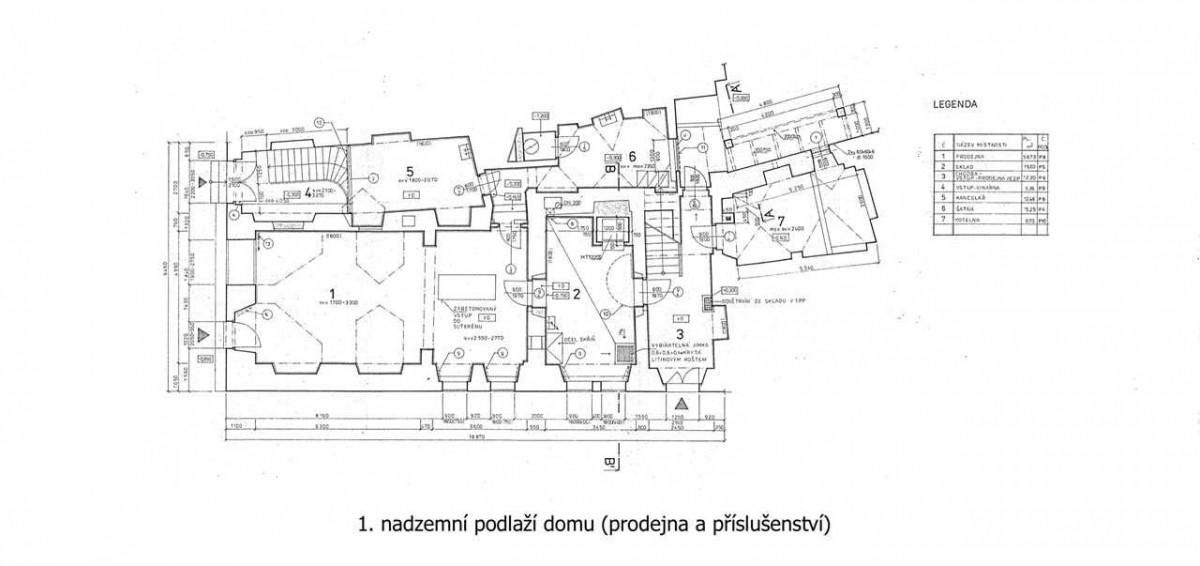 Stavba stojí na křižovatce ulic Žatecká a Sládkova, jedná se tak o rohový řadový dům. Přízemí je využito k obchodním účelům a najdete zde velký obchodní prostor, kde byla prodejna se zázemím (kancelář, sklady, sociální zařízení). Do obchodu vedou dvě velké výlohy a řada oken v obvodové zdi. Do přízemí je také umístěna kotelna s plynovým kotlem a velký sklad, který ústí do zahrady.
