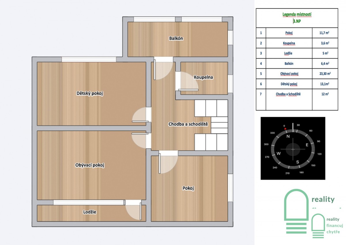 1. patro: koupelna, dva menší pokoje a jeden větší pokoj, který má vlastní lodžii.