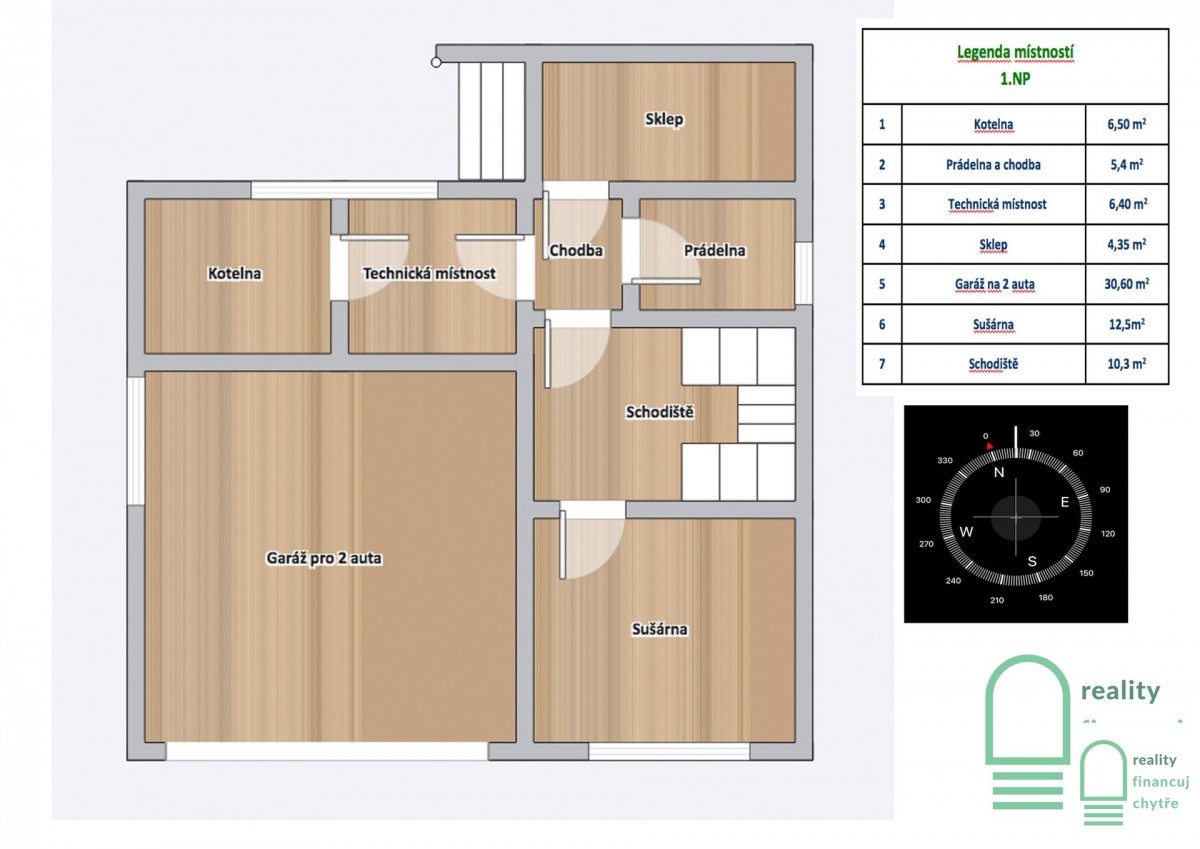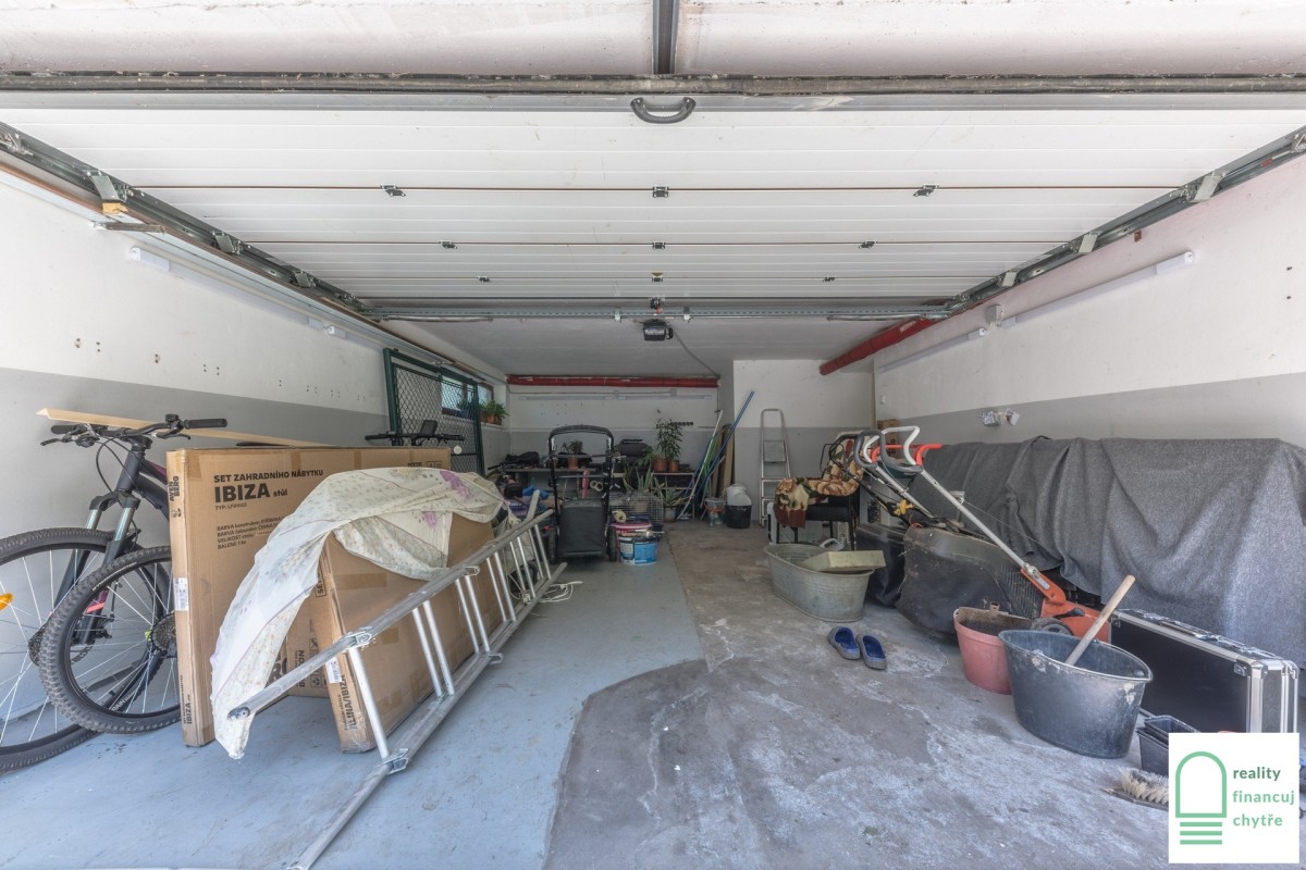 Suterén: dvojgaráž s elektrickými vraty, dílna, technická místnost, prádelna a sklep.