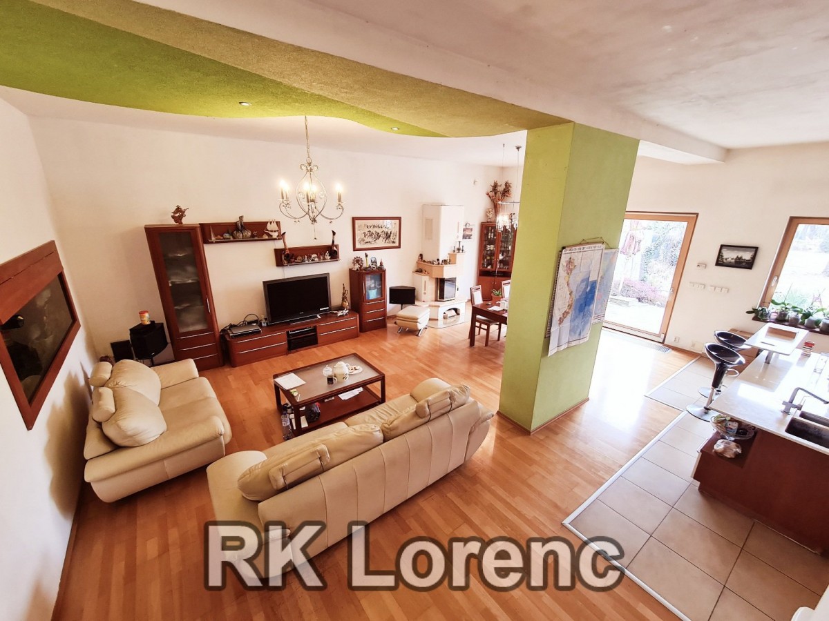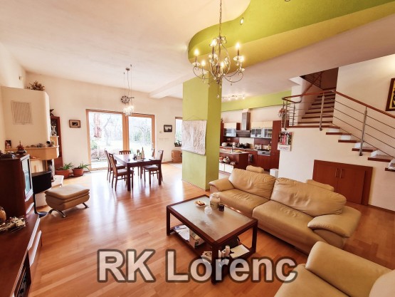 Dispozice: v přízemí orientovaném do zahrady se nachází velká kuchyně dělaná na míru od Sýkory se spotřebiči zn. Siemens, dále moderním krbem s obývacím prostorem 58. 7 m2, koupelna 6 m2 se sprchovým koutem, samostatná toaleta 2. 4 m2, šatna 4. 3 m2, hala 8. 5 m2, zádveří 3. 8 m2, podlahové vytápění, dvougaráž 35. 9 m2, technická místnost 7. 4 m2, samotné schody do patra. V patře je další pět neprůchozích pokojů 19. 3 m2, 19. 1 m2, 14. 7 m2, 14. 3 m2, 13. 7 m2, koupelna 8. 1 m2, samostatná toaleta 2. 4m2, velká chodba 30. 2 m2 se vstupem na balkón 4. 4 m2. Dále Velká půda, z které je možnost vybudovat další obytné místnosti. Parkování před domem další dvě místa.