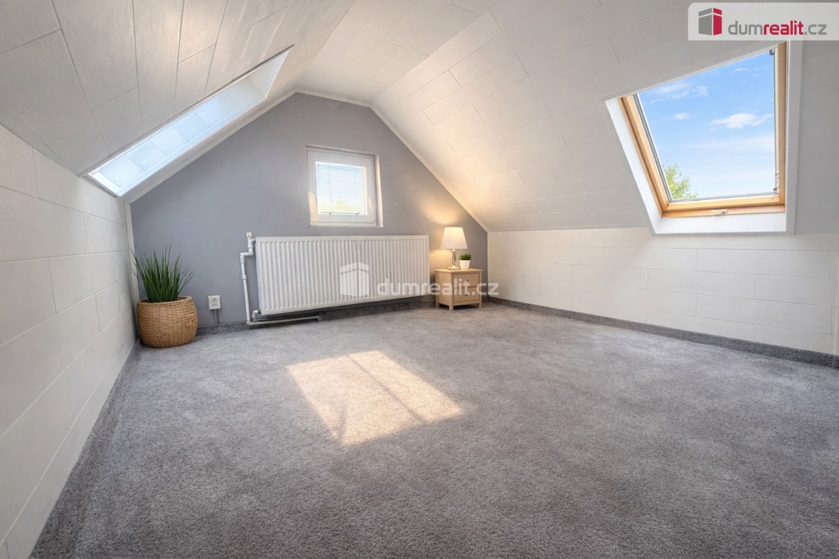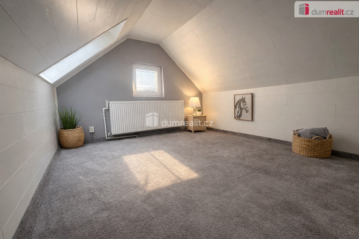Druhé patro nabízí další obytný prostor s krásnou, moderní kuchyní, obývacím pokojem, ložnicí a pracovnou. Odtud je také přístup do podkroví, kde se nachází dva útulné pokoje, ideální například pro děti.