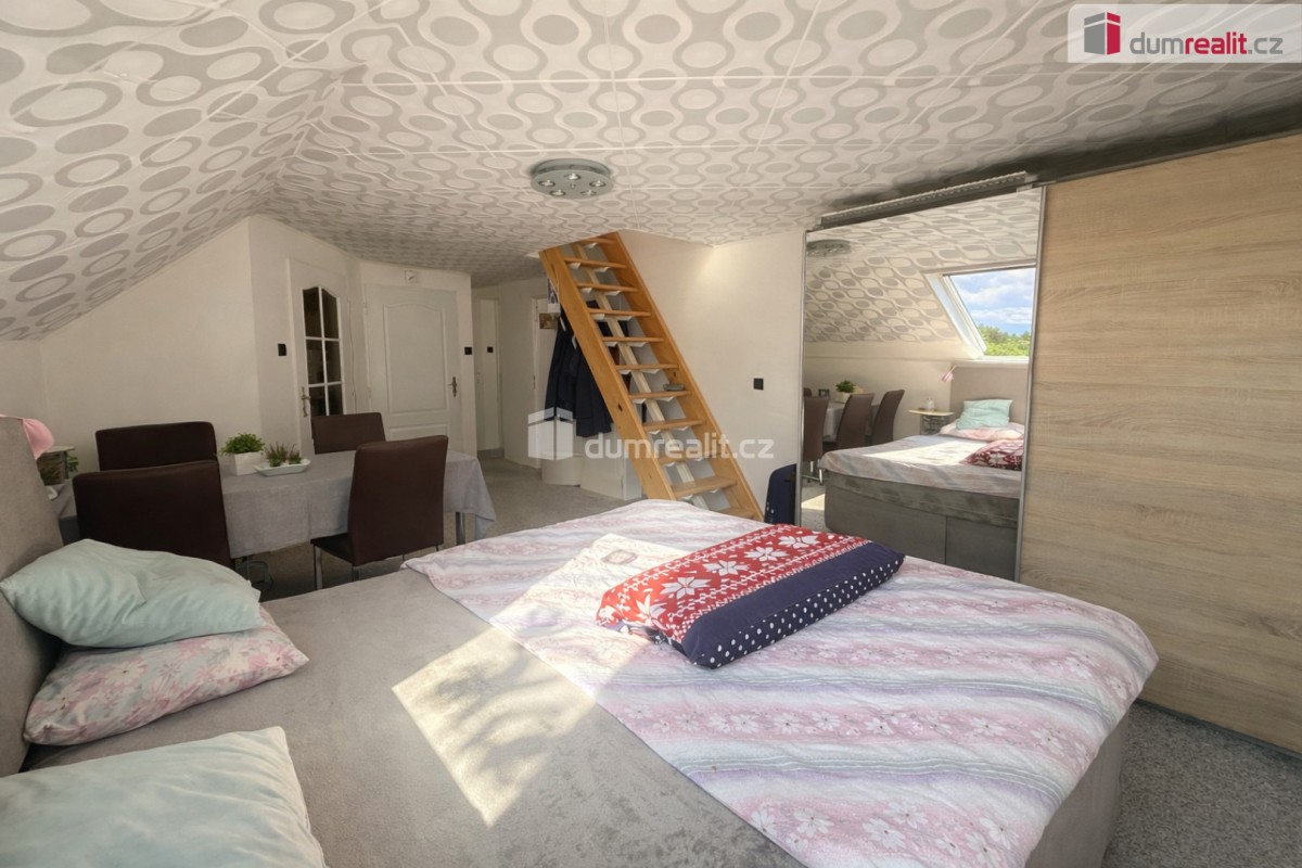 V prvním patře je samostatná bytová jednotka s dispozicí zahrnující ložnici, obývací pokoj, kuchyň, koupelnu a toaletu.