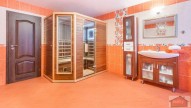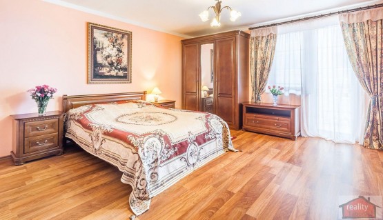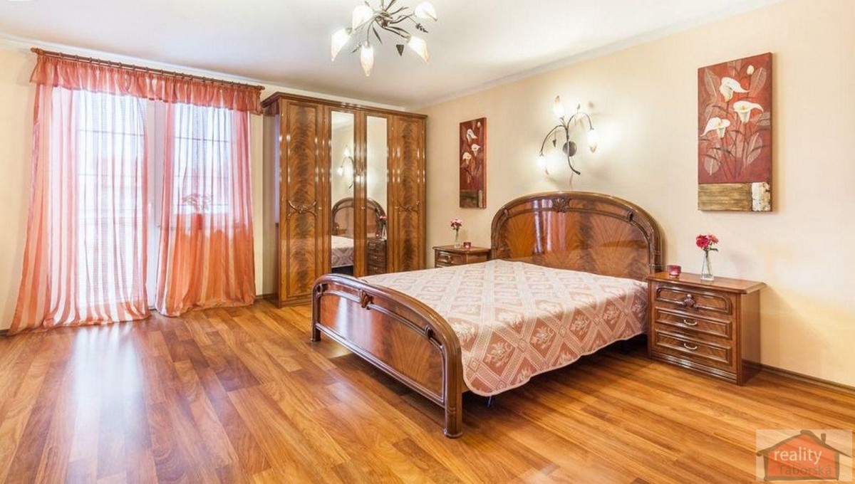 V patře jsou tři pokoje po 24 m2 a jeden 38 m2. Jeden z těchto pokojů má vlastní koupelnu se sprchou a sociální zařízení WC. Ze dvou pokojů je také přímý vstup na balkon. Dále je tu prostorná společná koupelna s infra - saunou z kanadského cedru.