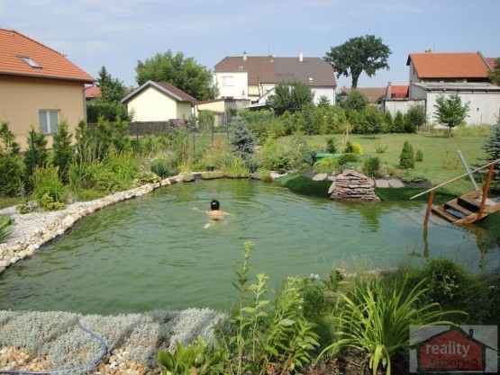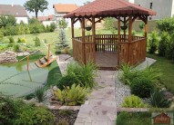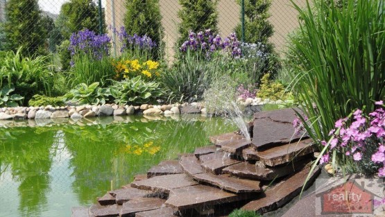 Vzrostlá zahrada (dekorační i ovocné stromy, keře) s novým zahradním domkem, altánem a koupacím jezírkem.