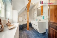 Interiér je dobře propracovaný s důrazem na detail a funkčnost. K dispozici jsou dvě koupelny, jedna v patře s rohovou vanou a druhá v přízemí se sprchovým masážním koutem.