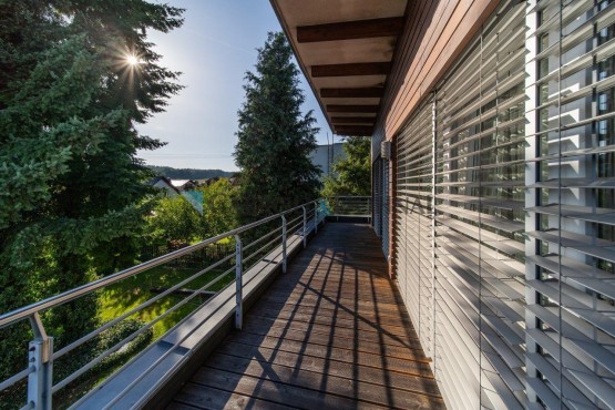Dům má dvě terasy ve 2. a 3. NP (třetí nadzemní patro) a balkón, dále 2 garáže s rolovacími vraty.