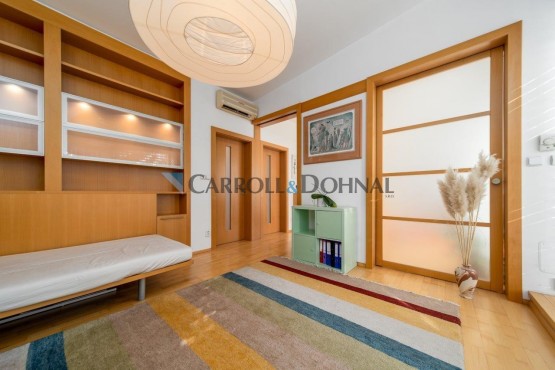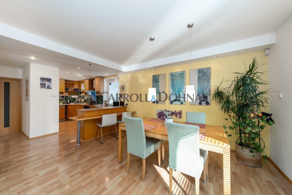 - do obytné zóny, po schodišti vstup do obývacího pokoje s navazující jídelnou a vybavenou kuchyní. Z obývacího pokoje, v němž se nachází funkční krb, výstup na terasu s markýzou na dálkové ovládání a zahradu.