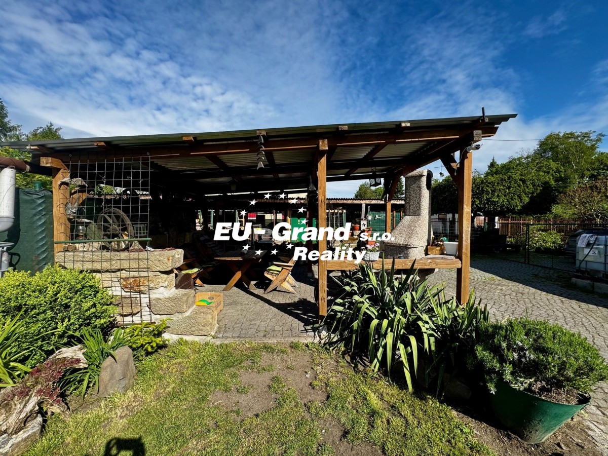 Na pozemku se nachází velká garáž s patrem, ideální pro dílnu, sklad nebo parkování. Příjemné posezení pod pergolou s ohništěm, venkovním krbem, udírnou a venkovním sociální zařízení WC.