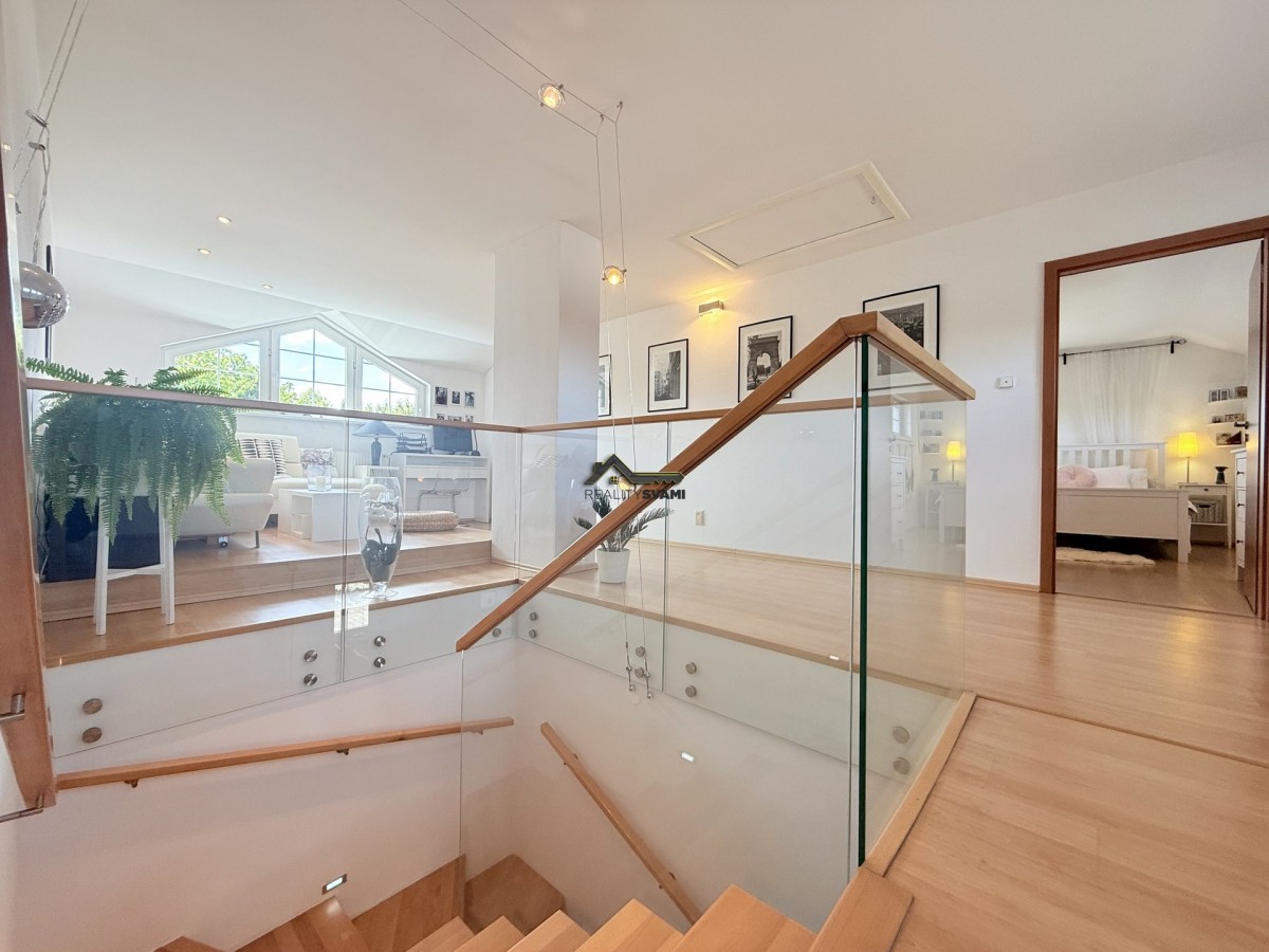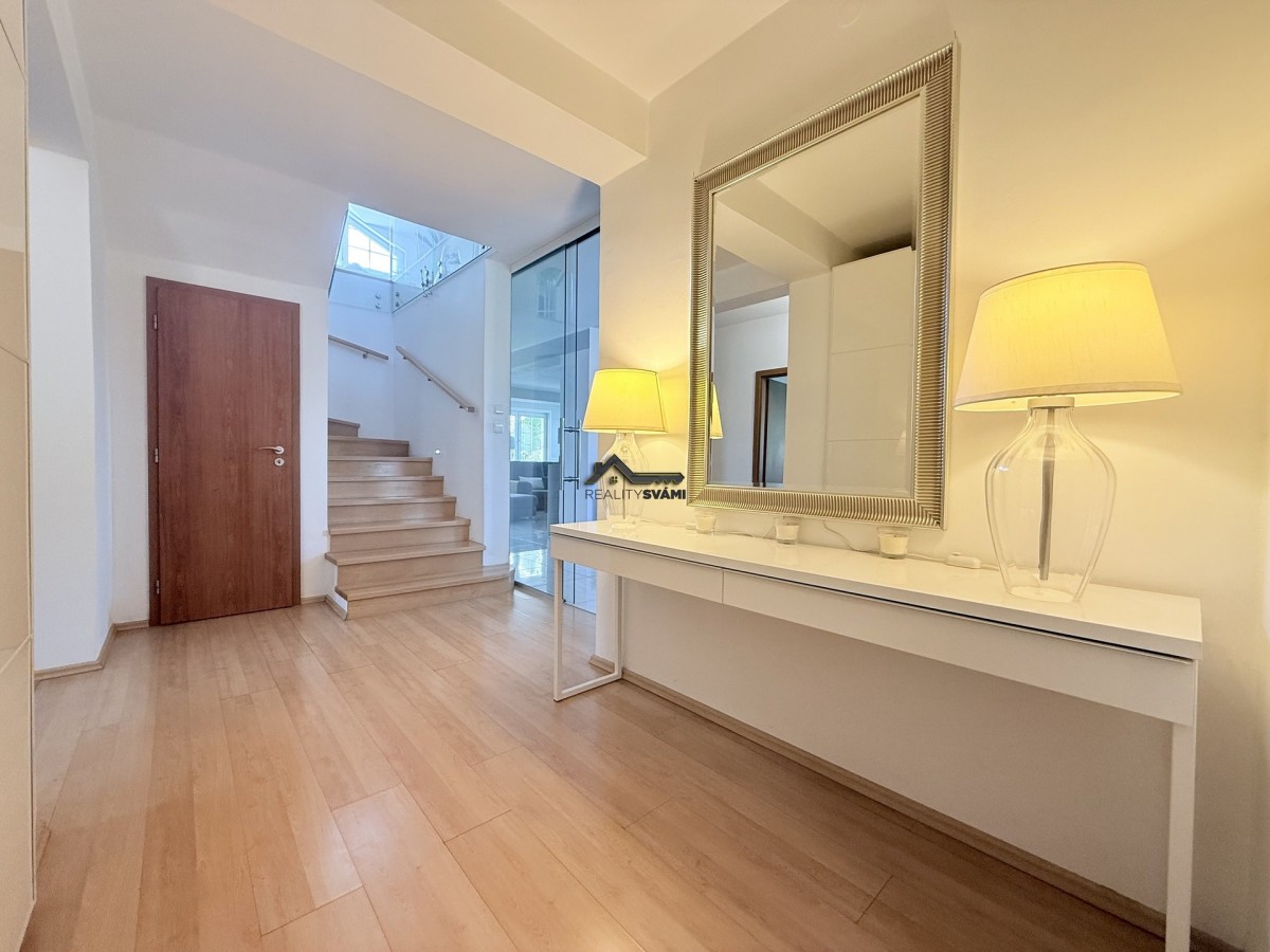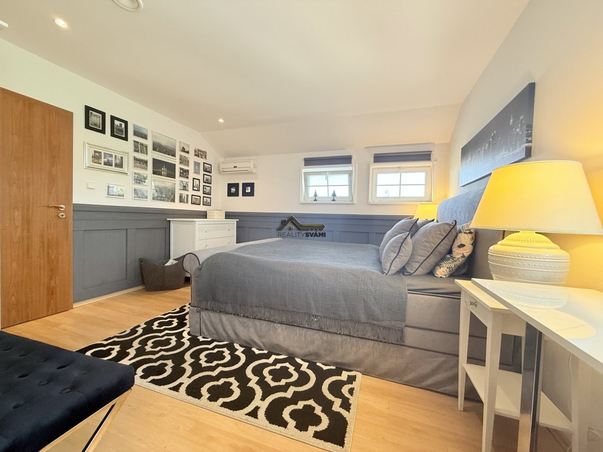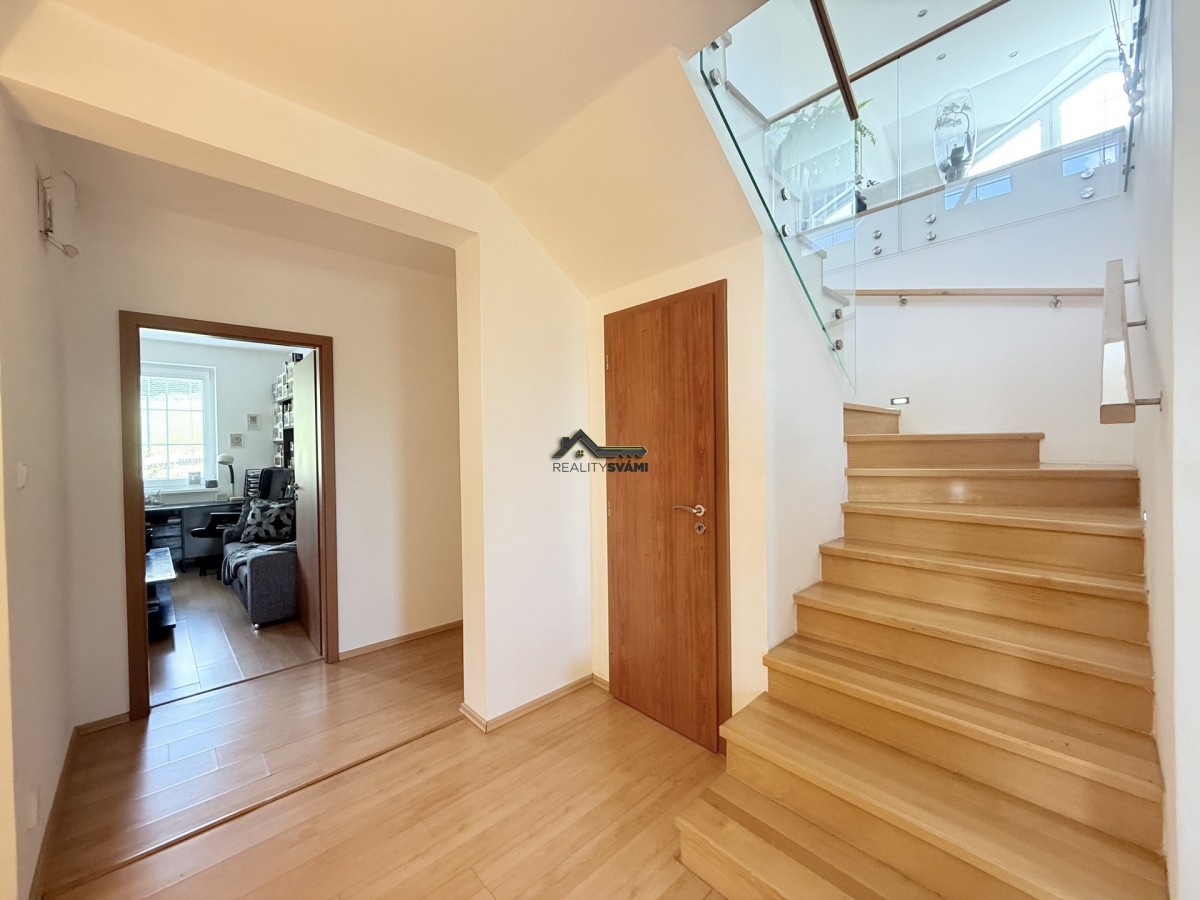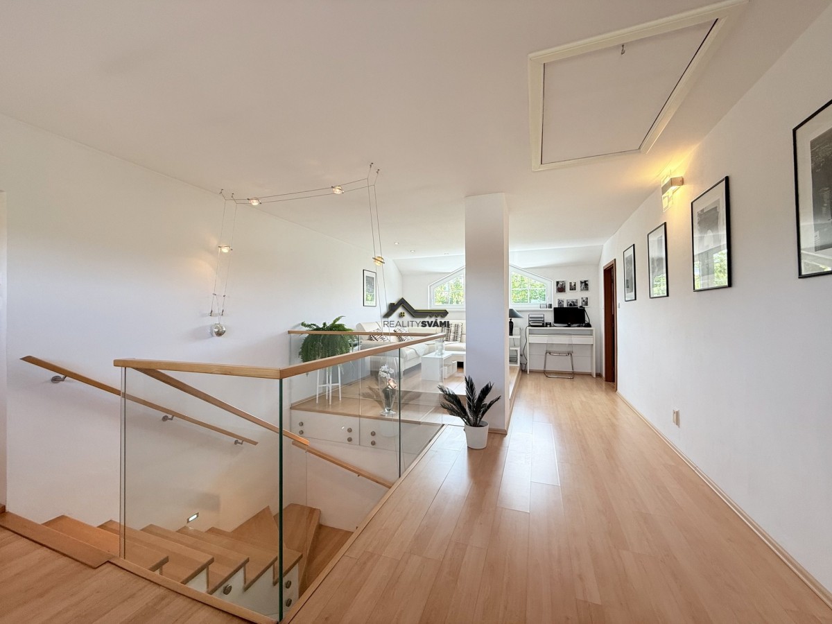 Přízemí domu tvoří velký obývací prostor spojený s kuchyňským koutem, spíží a jídelnou. Dále je zde technická místnost, garáž s centrálním vysavačem a technologií FVE, velká tělocvična, samostatné sociální zařízení WC, koupelna, infra sauna a dva větší pokoje. Prostorným schodištěm se dostanete do prvního patra, kde na vás čeká ložnice se samostatnou šatnou, 2 pokoje se společným balkónem a překvapí Vás prostorná galerie s možností posezení, která tyto pokoje rozděluje. Nechybí i velká moderní koupelna, kde je možné k relaxaci využít vestavěné reproduktory a pustit si tak hudbu, pro Vaše pohodlí.